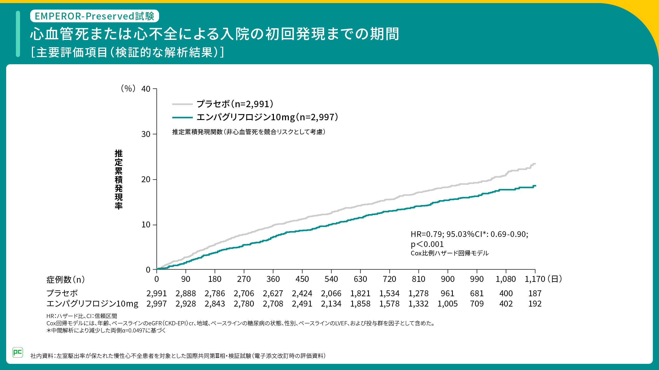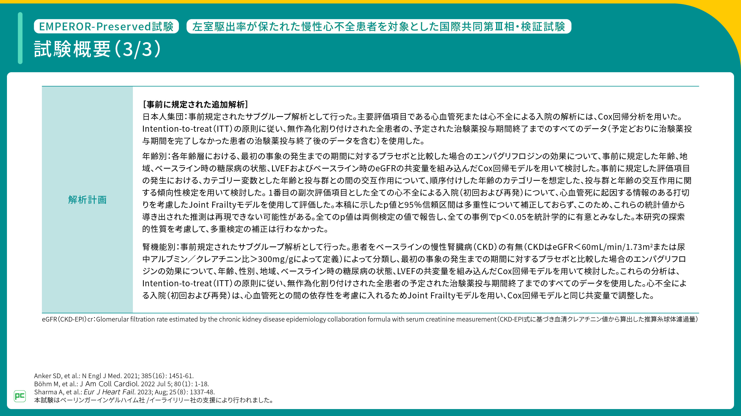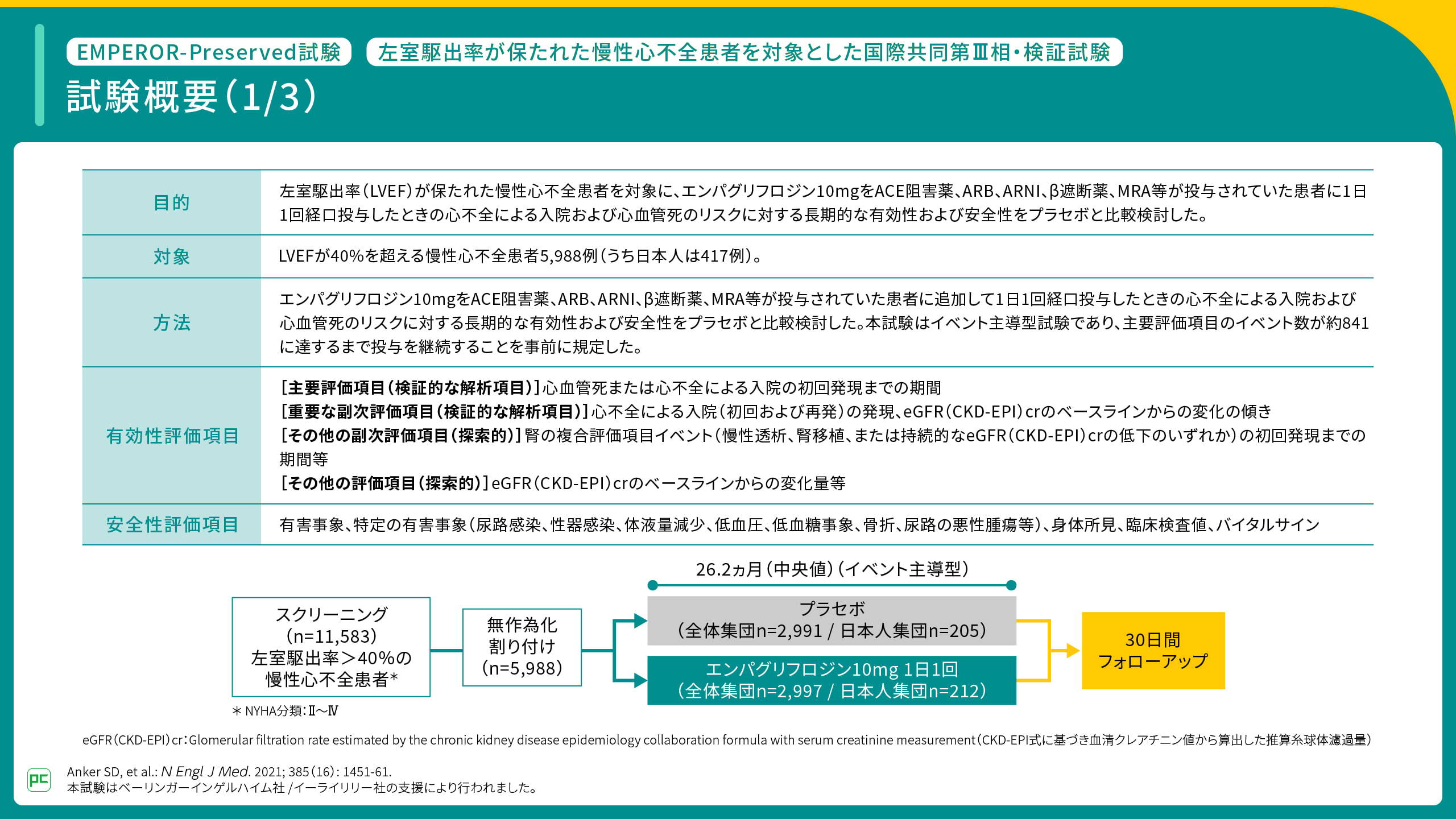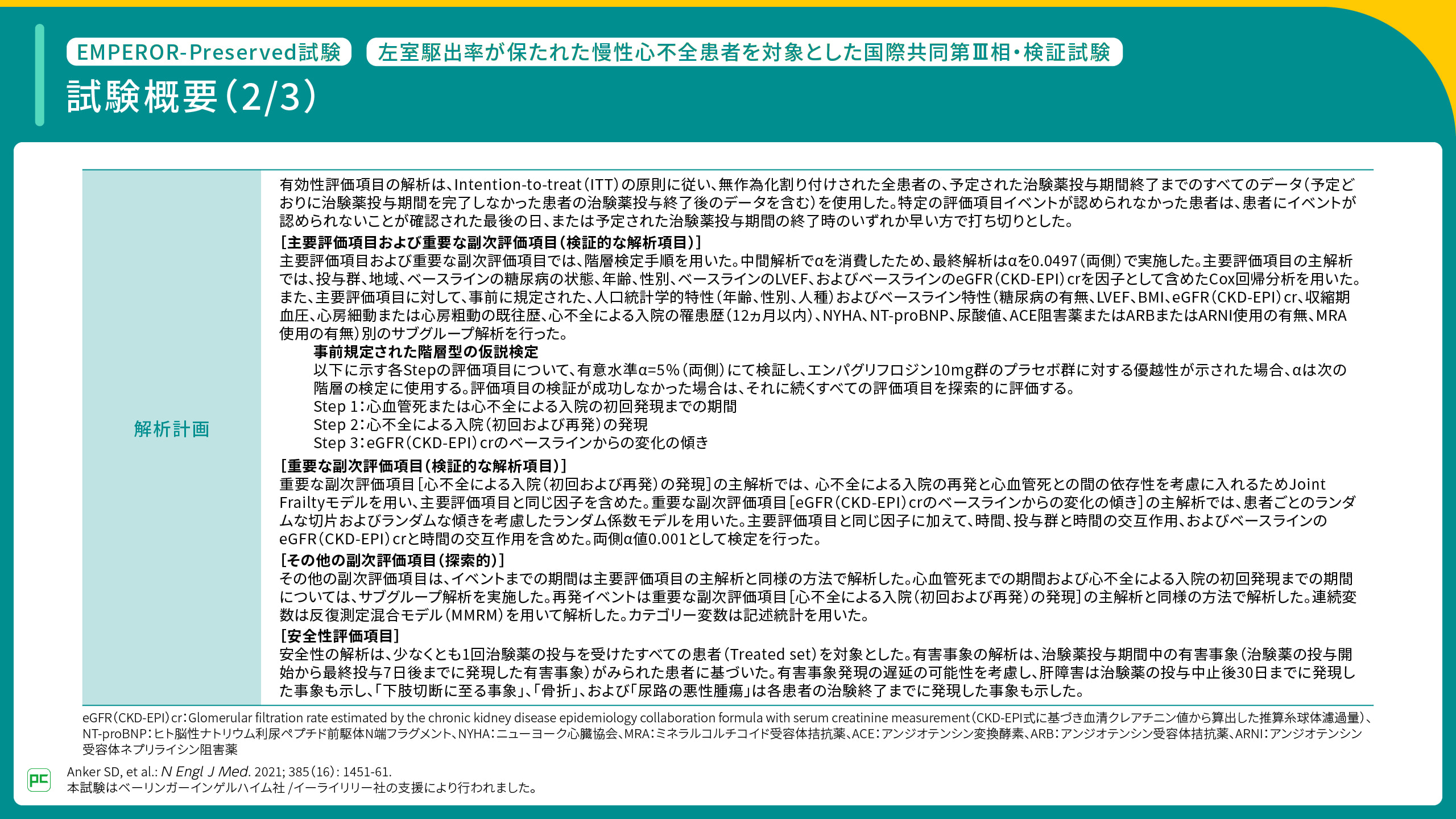 - Anker SD, et al. N Engl J Med. 2021; 385(16): 1451-61. (本試験はベーリンガーインゲルハイム社/イーライリリー社の支援により行われた)