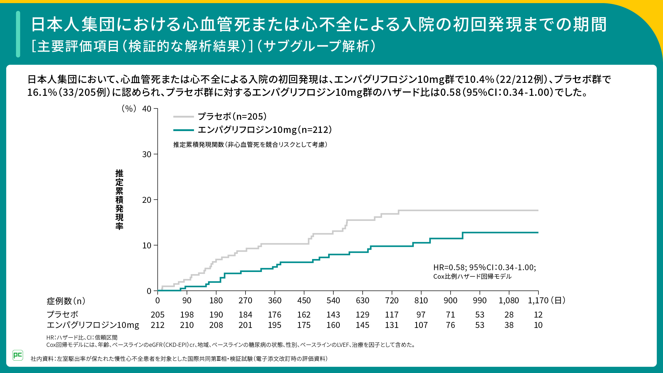 日本人集団において、心血管死または心不全による入院の初回発現はジャディアンス群で10.4%、プラセボ群で16.1%に認められ、プラセボ群に対するジャディアンス群のハザード比は0.58(95%CI:0.34~1.00)でした(図12)。