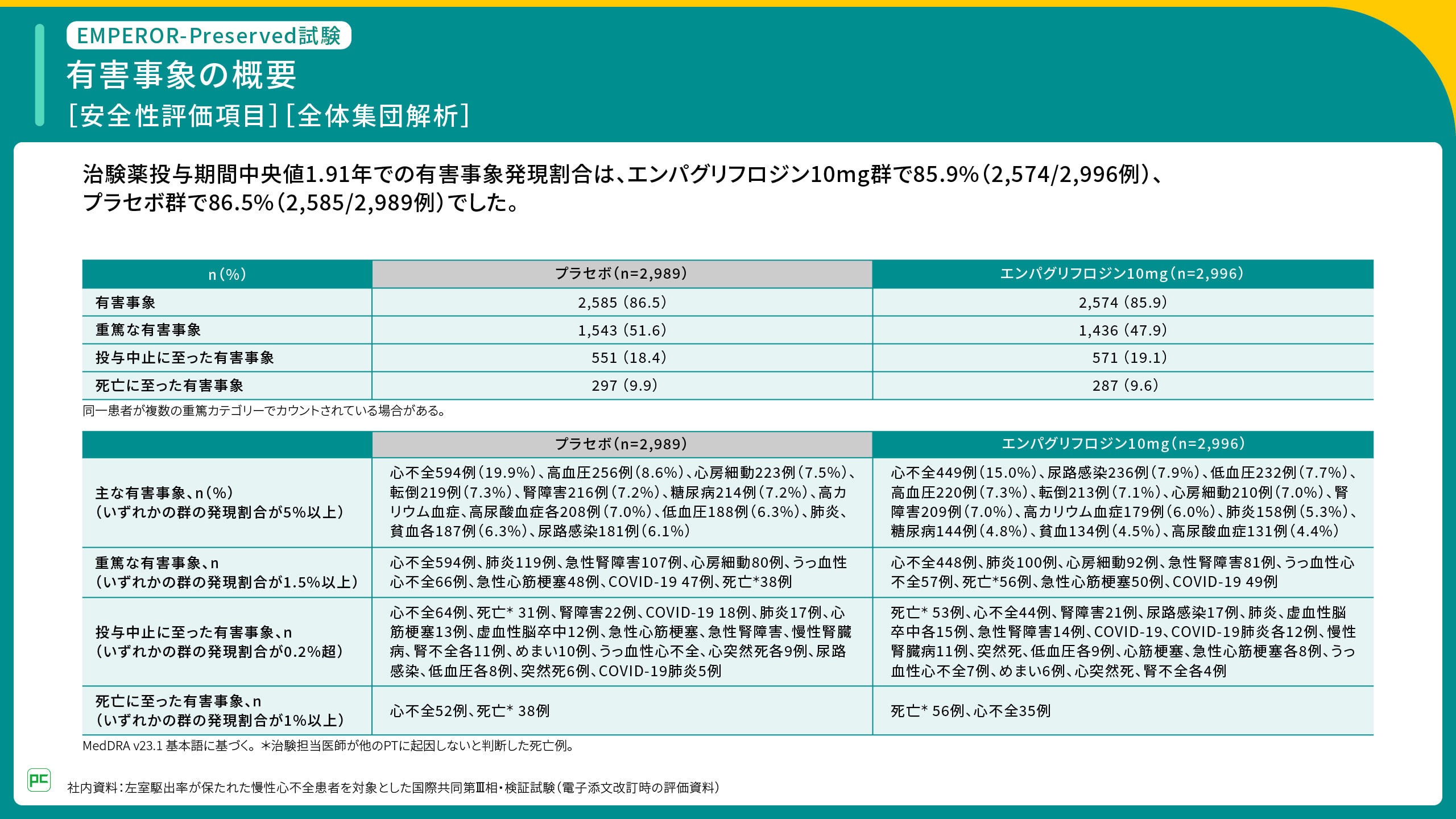 EMPEROR-Preserved試験の全体集団における有害事象発現割合は、治験薬投与期間中央値1.91年においてジャディアンス群で85.9%(2,574/2,996例)、プラセボ群で86.5%(2,585/2,989例)でした。ジャディアンス群で発現割合が5%以上の有害事象は、心不全15.0%、尿路感染7.9%、低血圧7.7%、高血圧7.3%、転倒7.1%、心房細動7.0%、腎障害7.0%、高カリウム血症6.0%、肺炎5.3%でした。