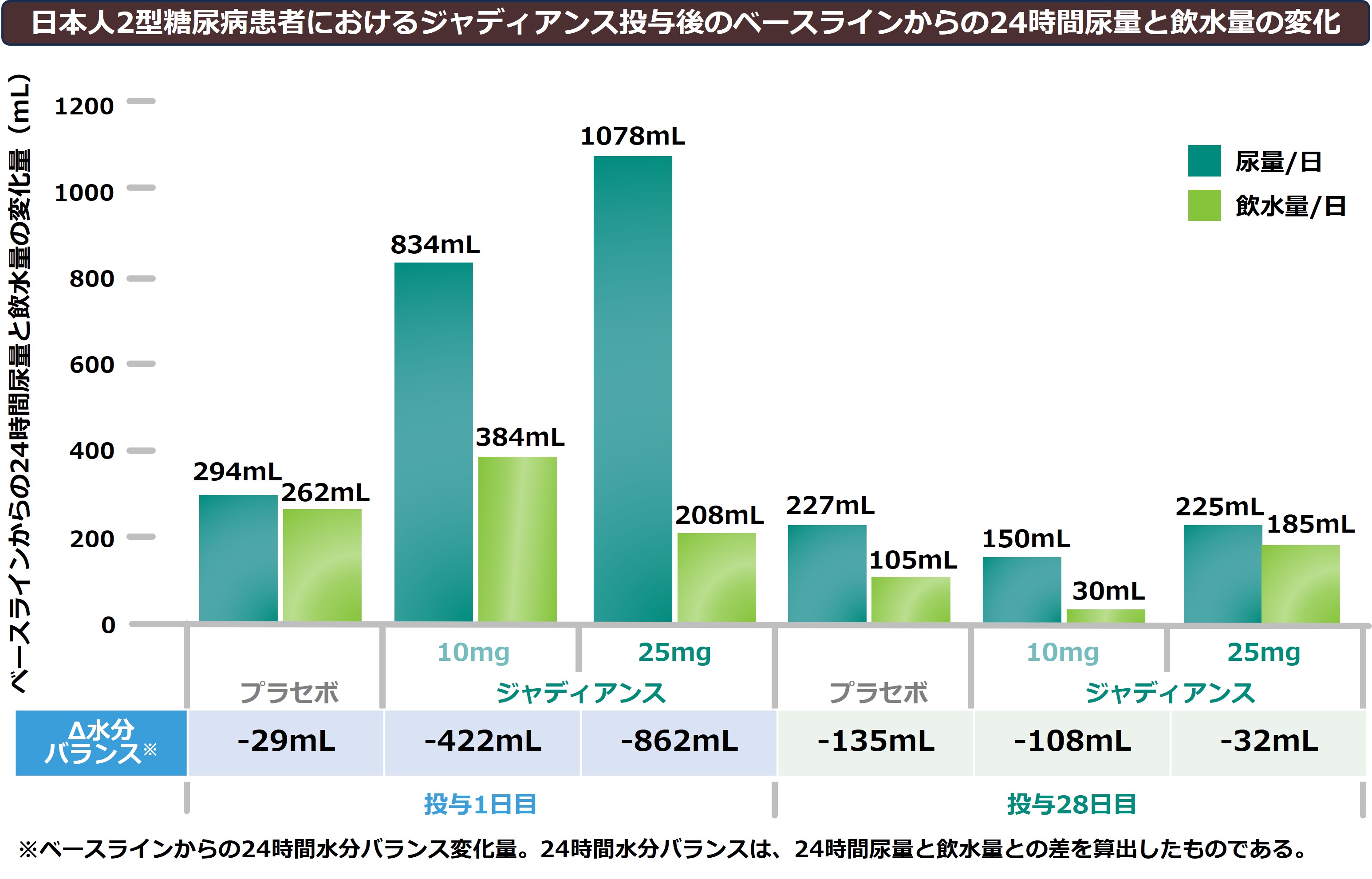 投与1日目にジャディアンス投与群で認められた尿量の増加は、投与28日目には認められませんでした。また、同様に水分バランス*の変化を検討したところ、投与28日目では、ジャディアンス10mg群で-108ml、25mg群で-32mL、プラセボ群で-135mlでした。これらは、日本人2型糖尿病患者にジャディアンスを投与した際に、水分バランスを維持する腎臓の生理学的なメカニズムが働いている事によるものと推測されます。