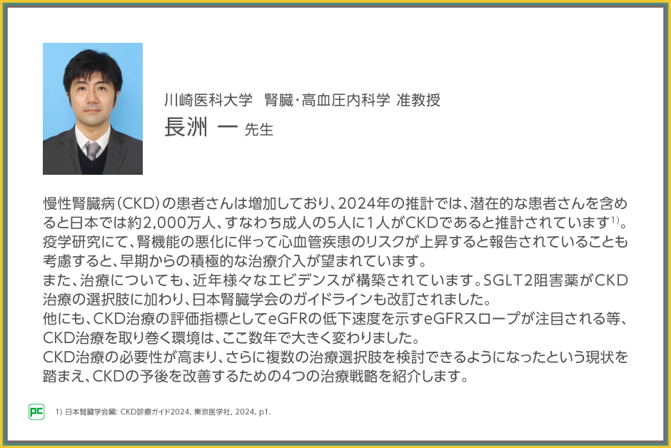 治療選択肢の増加等、CKDを取り巻く環境は近年大きく変化しています。今回は、長洲一先生に、CKDの治療戦略とジャディアンスの臨床成績についてご紹介いただきました。