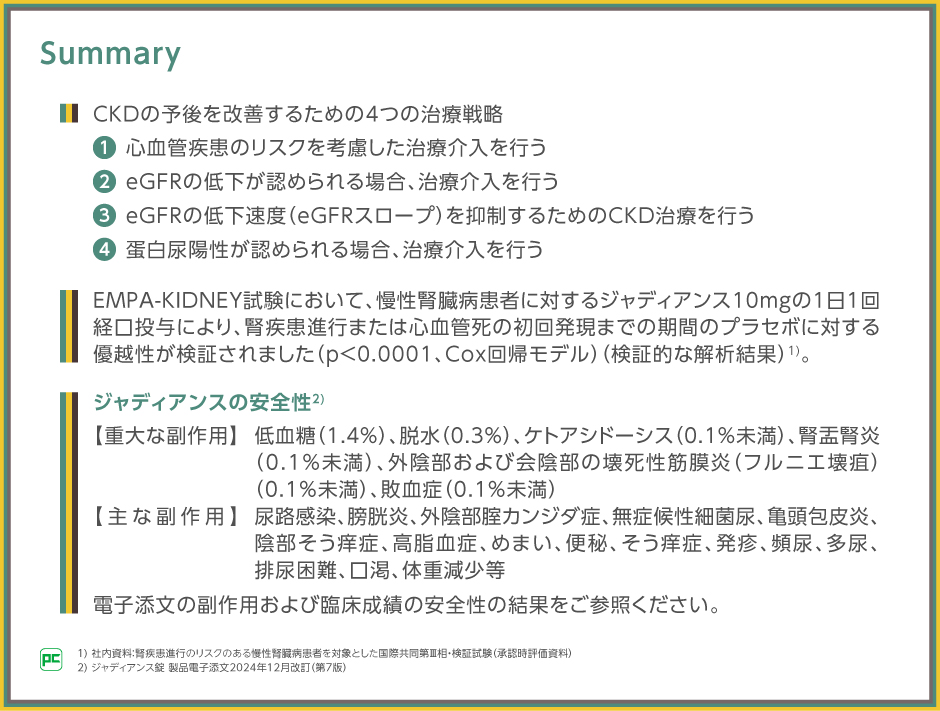 今回ご紹介したように、ジャディアンスは、CKDの治療戦略に必要なエビデンスを有しています。