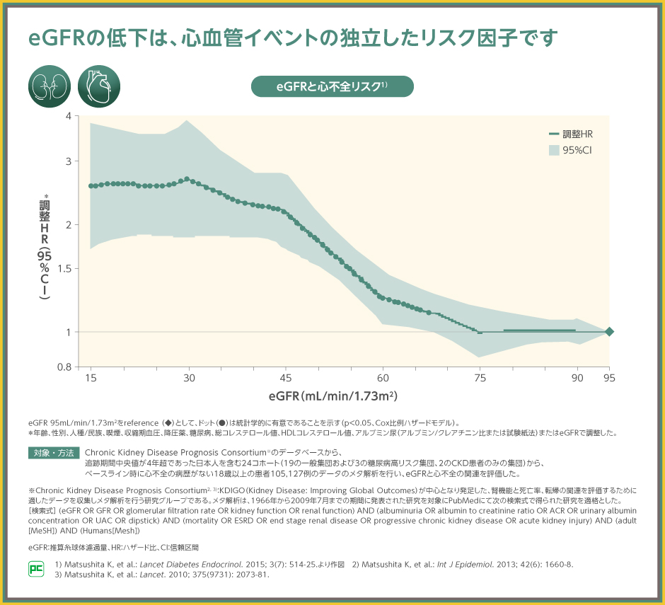 eGFRと心血管イベントの発現リスクを検討した解析において、CKDの診断基準の一つであるeGFR 60mL/min/1.73m2未満では心血管リスクのハザード比が1を超えることが示されました(p<0.05、Cox比例ハザードモデル)。