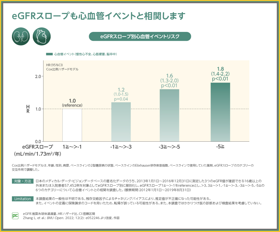 日本人の匿名化データを利用した調査では、eGFRの低下速度を示すeGFRスロープが負の方向に急峻なほど、心血管イベントリスクが高くなると報告されました。