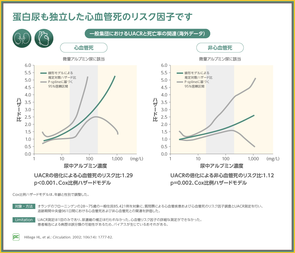一般集団において、UACRと死亡リスクの関連を検討した調査では、UACRの倍化が生じると、心血管死のイベントリスクが1.29倍となる(p<0.001、Cox比例ハザードモデル)ことが示されました。