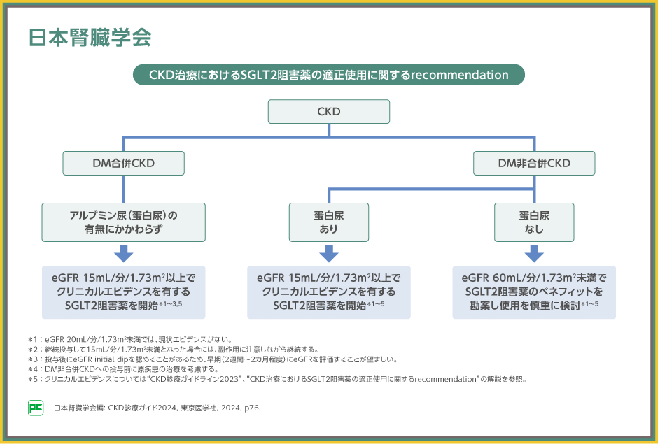 日本腎臓学会が公開している「CKD治療におけるSGLT2阻害薬の適正使用に関するrecommendation」では、患者像でお示ししたような、糖尿病を合併していないCKDで、蛋白尿がある場合は、クリニカルエビデンスを有するSGLT2阻害薬を開始することとしています。