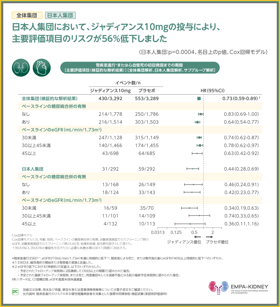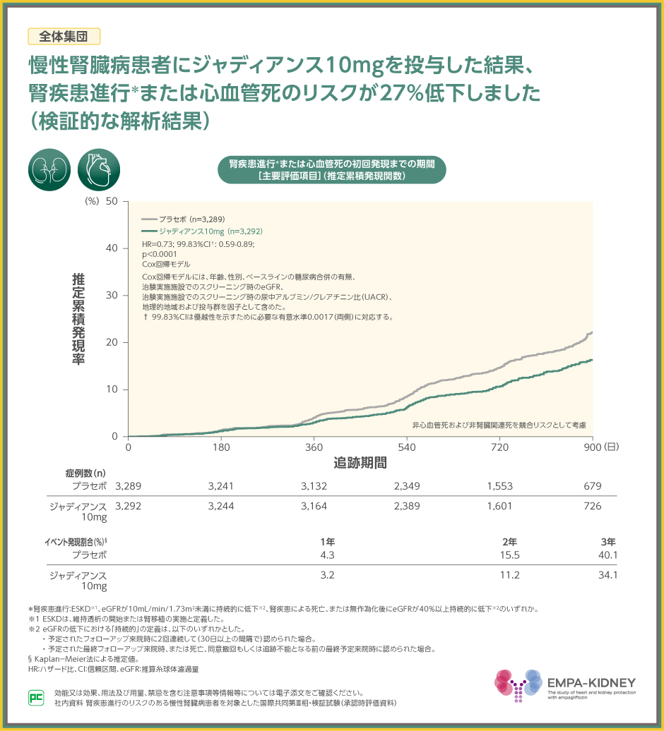 腎疾患進行または心血管死の初回発現までの期間を検討した結果、プラセボ群に対するジャディアンス10mg群のハザード比は0.73(99.83%CI:0.59~0.89)、p<0.0001(Cox回帰モデル)であり、ジャディアンス10mg群の優越性が検証されました。