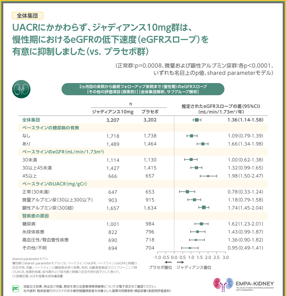 また、EMPA-KIDNEY試験では、ジャディアンスのeGFRの低下速度への影響を、eGFRスロープを用いて検討しました。