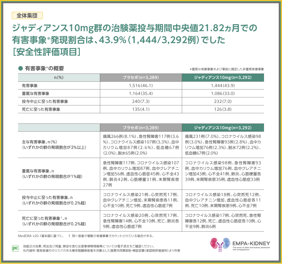 主な有害事象は、ジャディアンス10mg群で痛風7.0%、コロナウイルス感染3.0%、急性腎障害2.8%等でした。