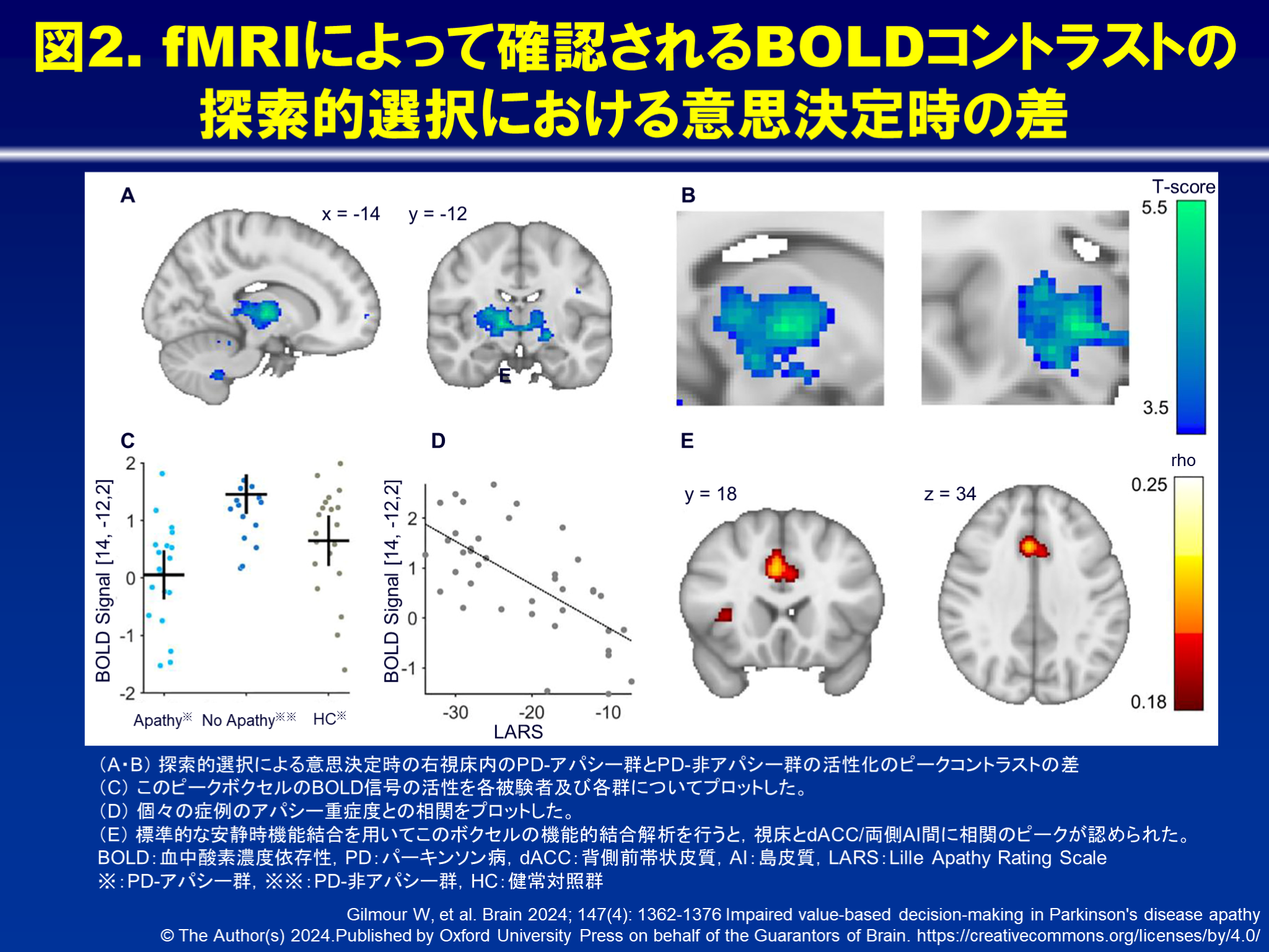 さらに、PD-アパシー群の探索的選択による意志決定は、健常対照群と同程度に前頭前野を活性化したが、PD-非アパシー群と健常対照群で認められた視床/中脳及び後頭頂葉の活性化は認められなかった。そのため、PD-アパシー群と、PD-非アパシー群で分析を行った。その結果、両側視床、両側前後中心回、頭頂溝、両側小脳、鳥距溝において活性クラスタが確認された(いずれもPcluster FWE WB <0.001,図2A, B)。各群の各被験者における探索的選択による意思決定時の活性クラスタの信号を検討し、さらにPD-アパシー群においてアパシーの重症度と活性クラスタの信号の関係を検討した結果、探索的選択による意思決定において活性クラスタは、アパシーの重症度と相関していた(Pcluster FWE WB =0.005,図2C, D)。アパシー重症度の予測因子である視床ボクセル間の皮質機能的結合解析を行うと、視床と背側前帯状皮質(dACC)/両側島皮質(AI)に相関のピークが確認された(図2E)。