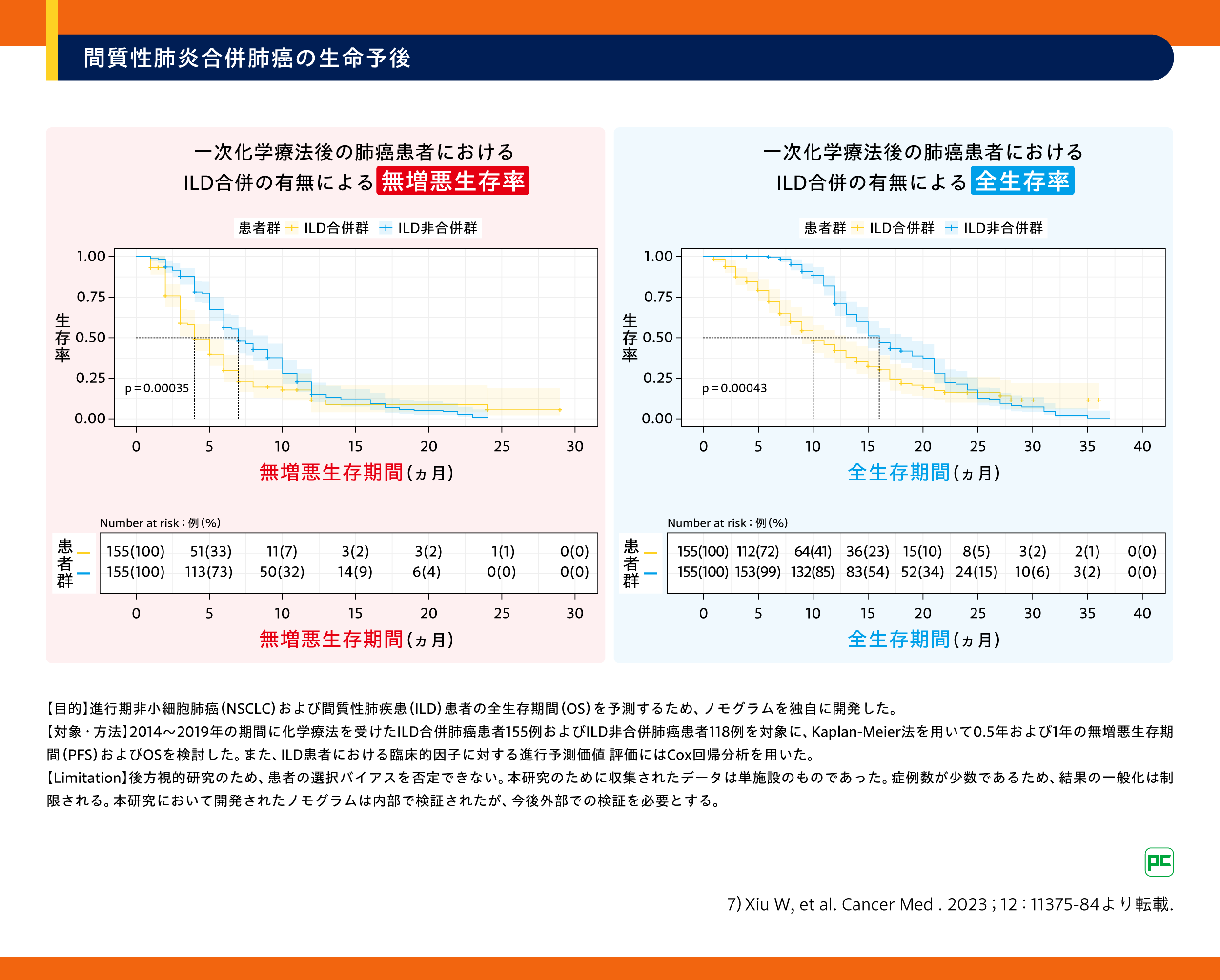 病期分類Ⅲ期以上の間質性肺炎合併肺癌では、間質性肺炎非合併例に比較して無増悪生存期間や全生存期間が3.0 vs. 7.0ヵ月、7.0 vs. 15ヵ月と有意に短くなっていることが報告されています(p=0.00035、p=0.00043、log-rank検定)(図1)7)。