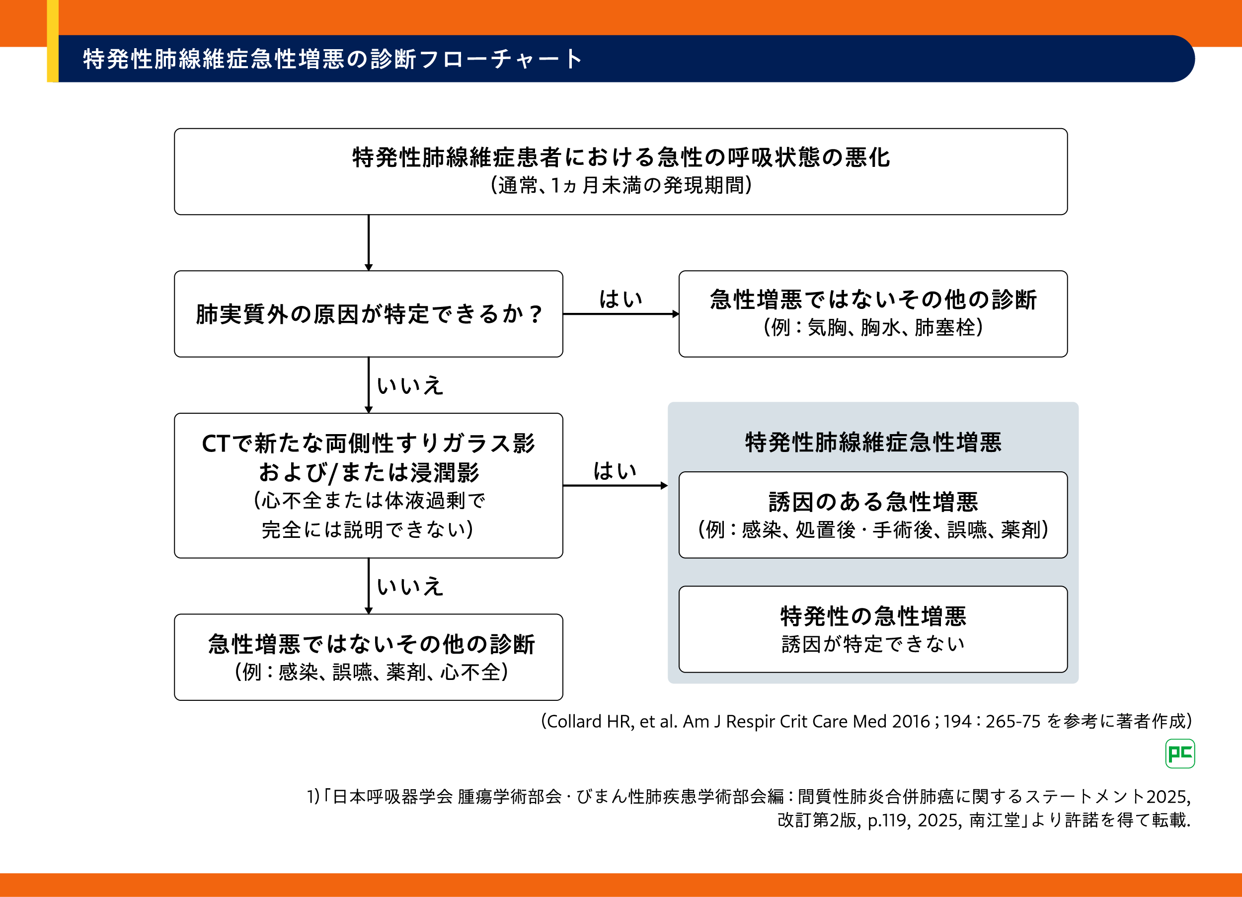 急性増悪は、国際的に「Idiopathic(特発性)」と「Triggered(誘因性)」に分類されています16)。誘因としては、感染性や誤嚥、手術、全身麻酔、薬剤などがあげられ、これらの誘因に対する予防策が適切に講じられれば急性増悪を回避できる可能性があります。