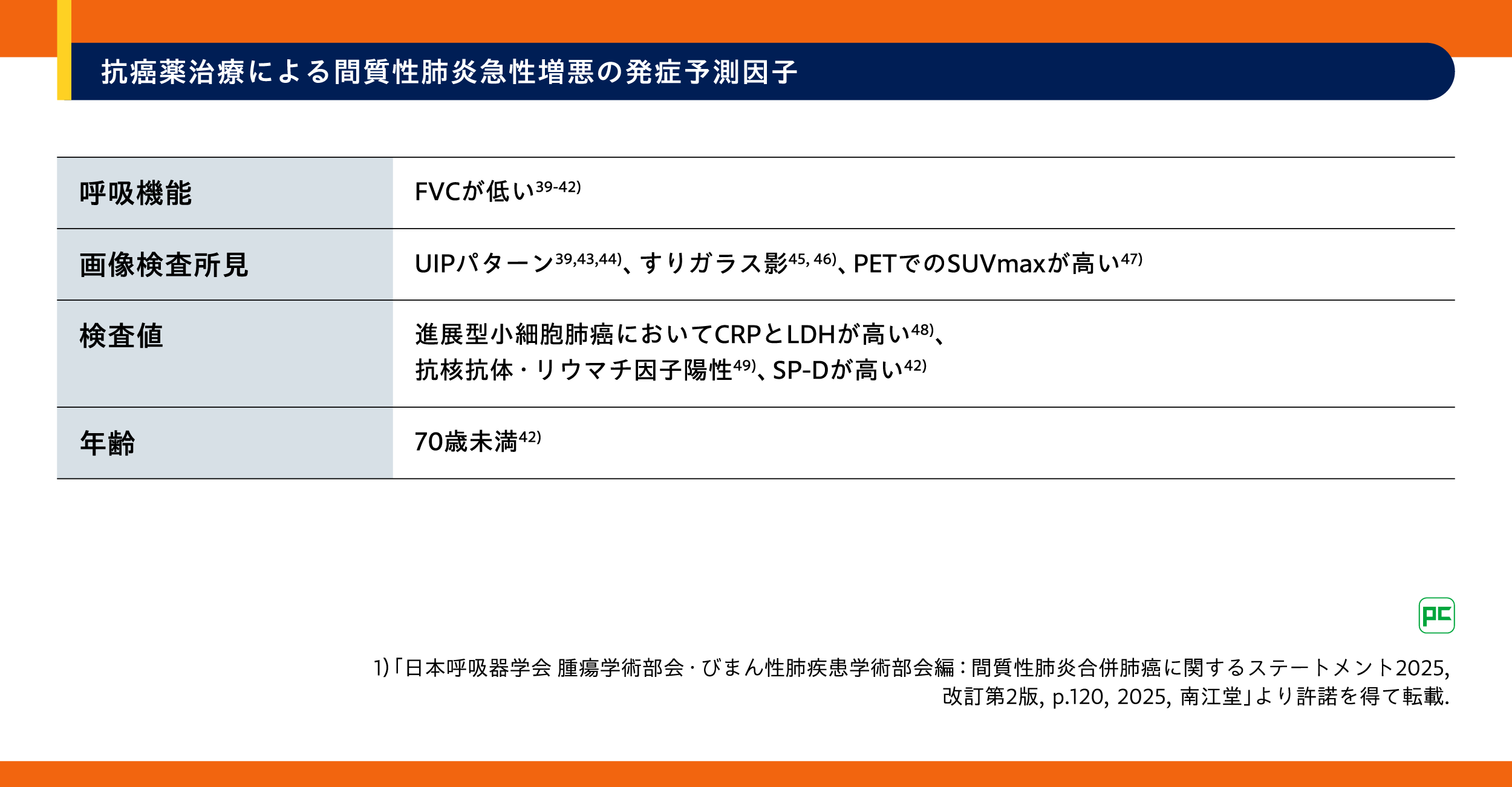 また、間質性肺炎の急性増悪のうち抗癌薬が原因であるものに限定して、発症予測因子が報告されているものは表6の通りです39)-49)。