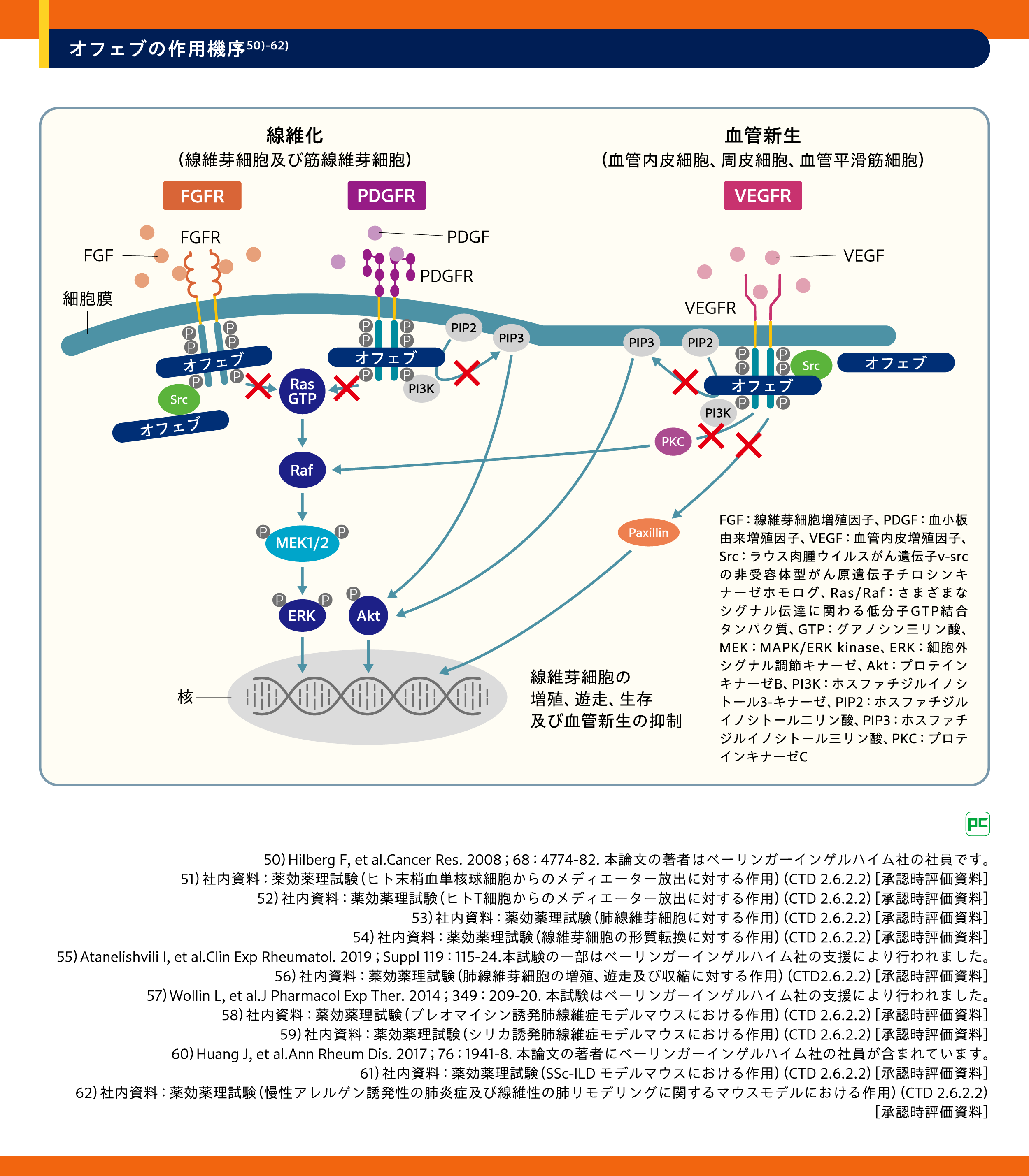 オフェブは、血小板由来増殖因子受容体(PDGFR)α、β及び線維芽細胞増殖因子受容体(FGFR)1、2、3及び血管内皮増殖因子受容体(VEGFR)の各受容体においてアデノシン5′- 三リン酸(ATP)結合ポケットを占拠する低分子チロシンキナーゼ阻害剤であり、IPF、SSc-ILDおよびPF-ILDの発症に関与すると報告されているシグナル伝達を阻害します(図6)。