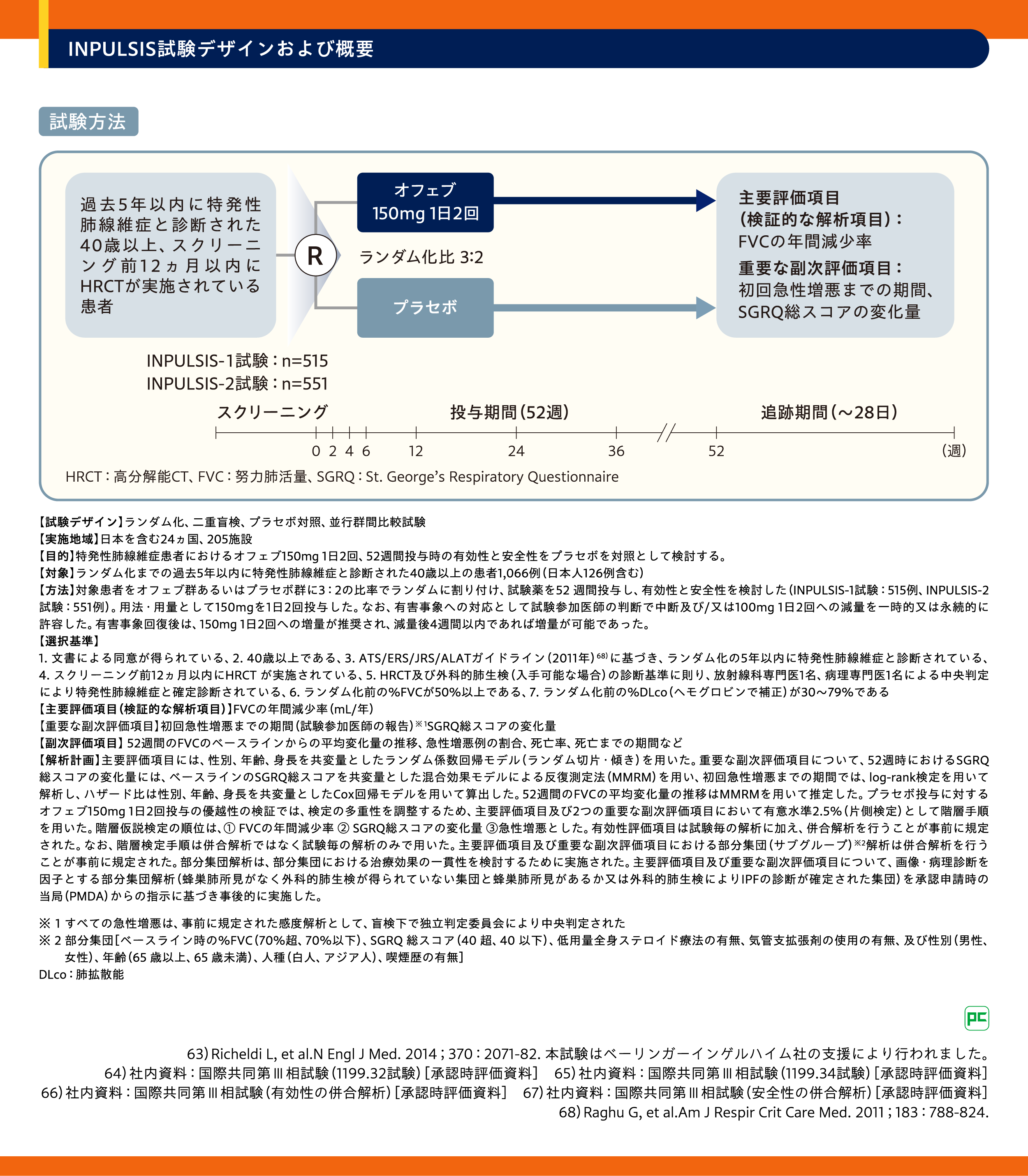 - Collard HR, et al. Am J Respir Crit Care Med. 2016; 194: 265-75. (本論文の著者にベーリンガーインゲルハイム株式会社より謝礼等の支払いを受けている者が含まれています)