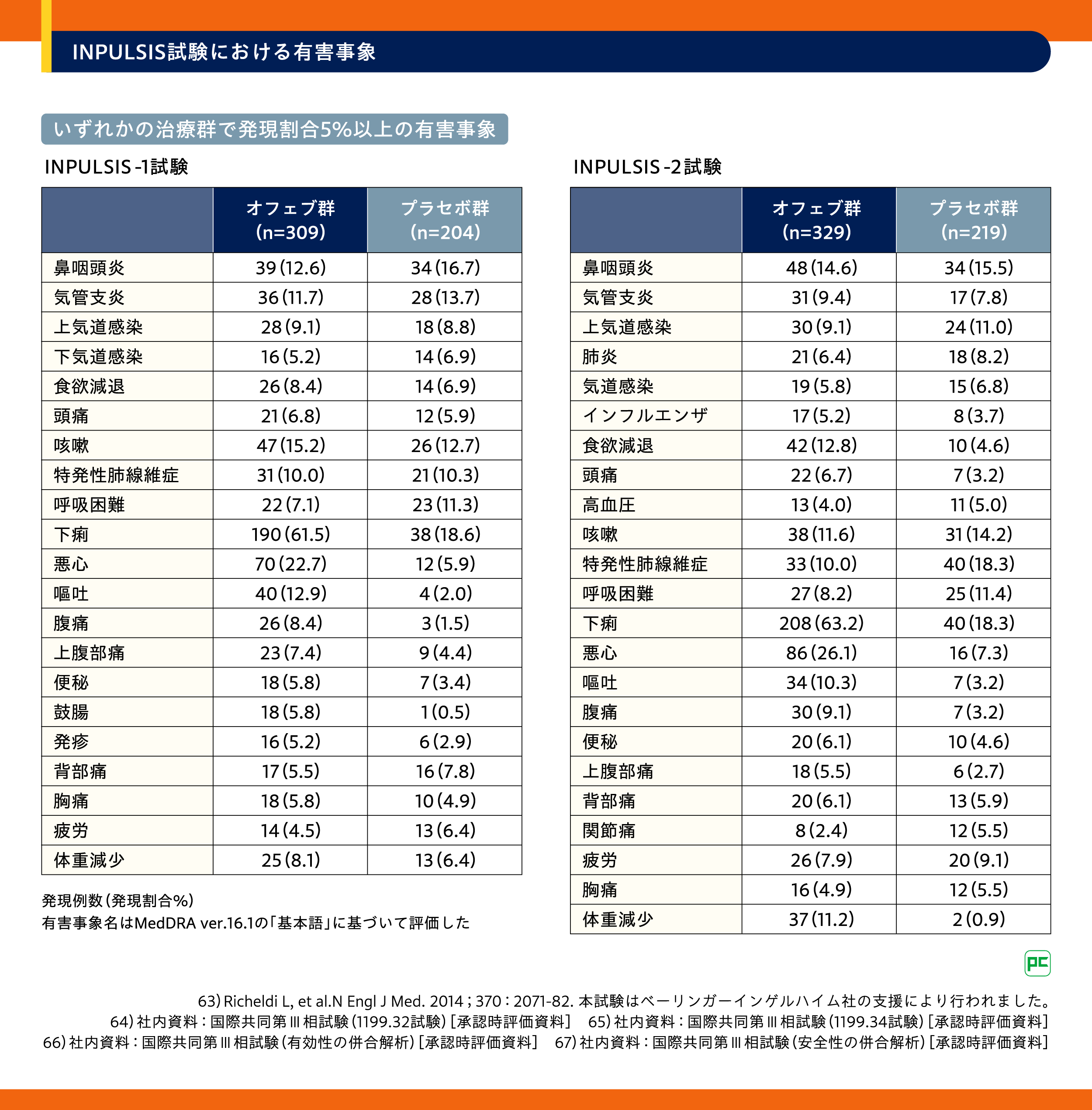 安全性については、INPULSIS-1試験における有害事象は、オフェブ群309例中298例(96.4%)、プラセボ群204例中181例(88.7%)に認められました。オフェブ群における重篤な有害事象※2は96例に認められ、主なもの(発現率2%以上)はIPF 20例(6.5%)でした。オフェブ群における投与中止に至った有害事象は65例に認められ、主なもの(発現率2%以上)は下痢14例(4.5%)、IPF、悪心が各7例(2.3%)でした。オフェブ群における死亡は12例に認められ、2例以上に認められた死因はIPF 7例、肺の悪性新生物2例でした。INPULSIS-2試験における有害事象は、オフェブ群329例中311例(94.5%)、プラセボ群219例中198例(90.4%)に認められました。オフェブ群における重篤な有害事象※2は98例に認められ、主なもの(発現率2%以上)はIPF 22例(6.7%)、肺炎18例(5.5%)でした。オフェブ群における投与中止に至った有害事象は58例に認められ、主なもの(発現率1%以上)は下痢14例(4.3%)、悪心、IPFが各6例(1.8%)、肺炎5例(1.5%)、食欲減退4例(1.2%)でした。オフェブ群における死亡は25例に認められ、2例以上に認められた死因はIPF 11例、肺炎5例、心筋梗塞、呼吸不全が各2例でしたが、いずれも試験薬との因果関係は否定されました。主な有害事象(いずれかの治療群で発現率5%以上の有害事象)を表7に示します。