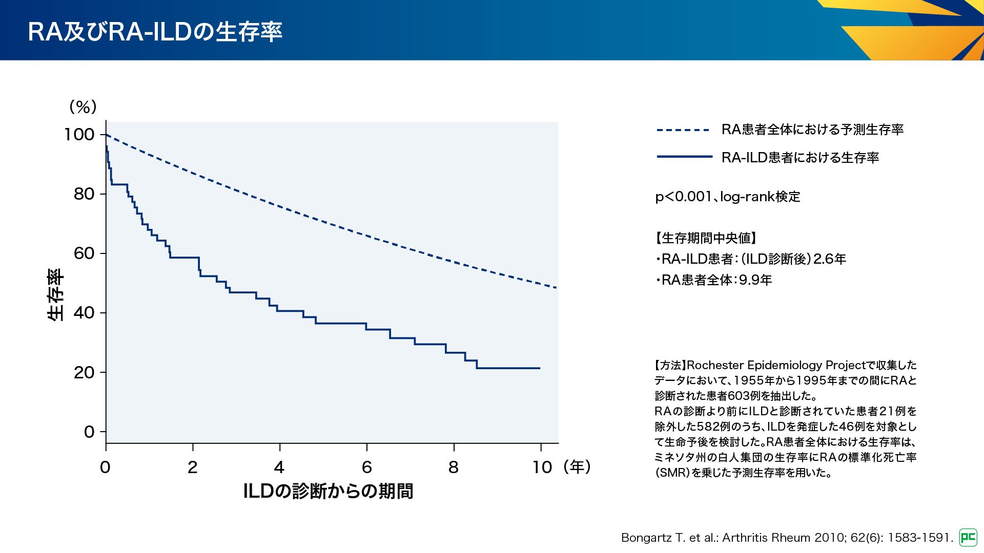 RA-ILDはRA患者さんの約28~67%にみられ1)、死亡原因の11.1%を占めることが報告されています2)。また、RA-ILD患者さんにおけるILD診断後の生存期間中央値は2.6年であり、RA患者さん全体の9.9年と比較して有意に短いことが示されています(図1)3)。このように、ILDはRA患者さんの予後に影響する重要な因子です。