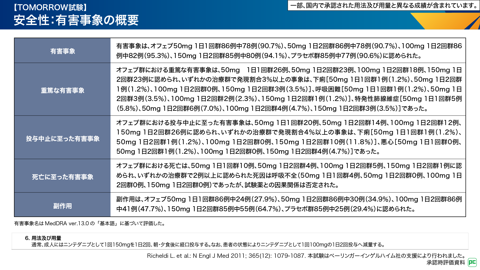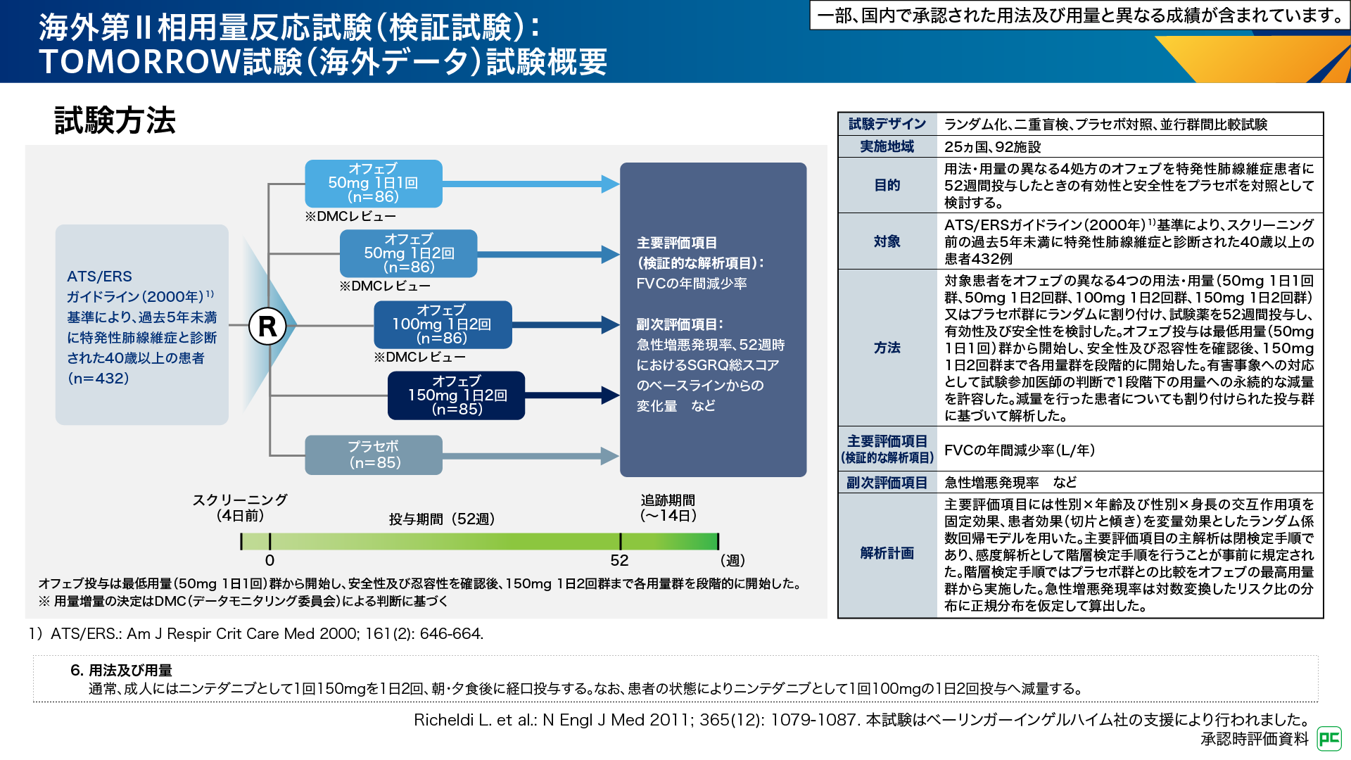 - Richeldi L. et al.: N Engl J Med 2011; 365(12): 1079-1087. 本試験はベーリンガーインゲルハイム社の支援により行われました。