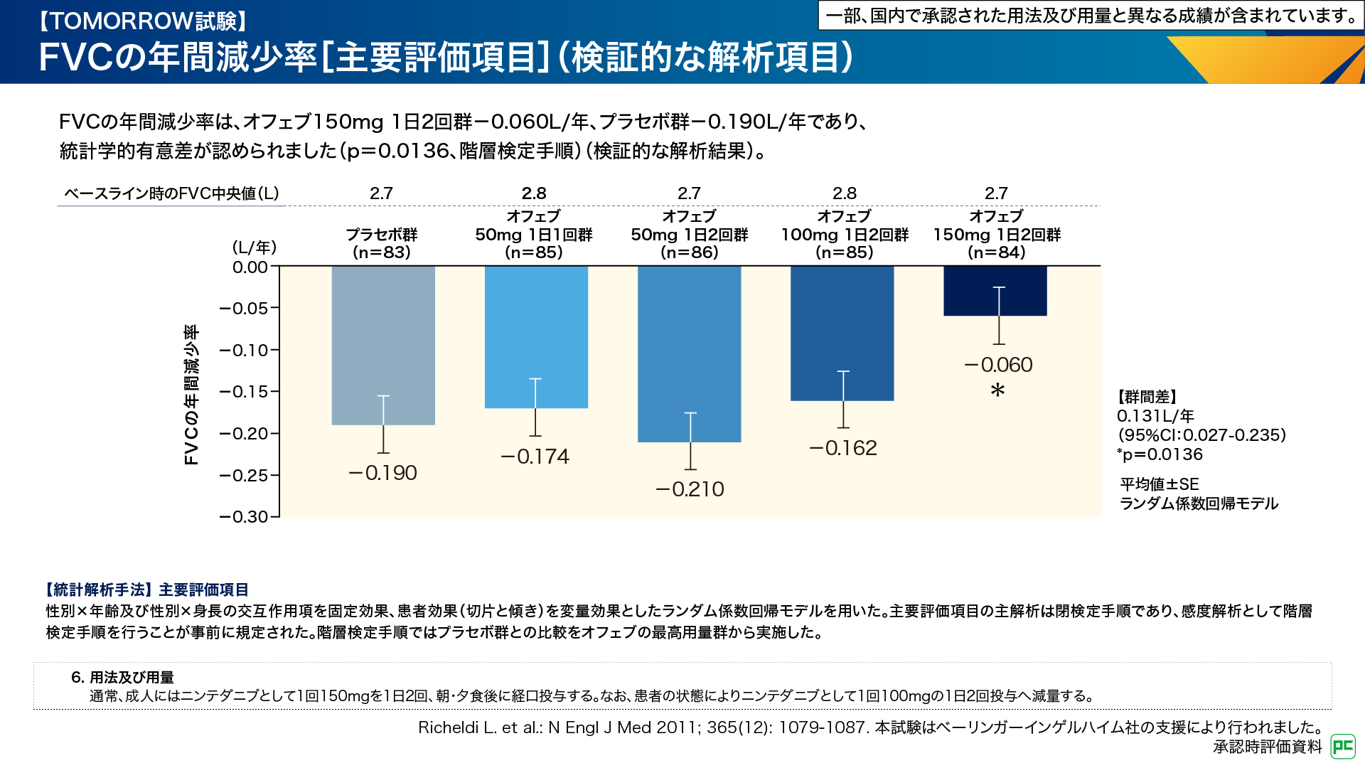 このように、FVCの年間減少率及び急性増悪発現率において、投与開始時のオフェブの投与量が150mg 1日2回の群でのみプラセボ群との間に有意差が認められました6,7)。この結果は、電子添文に記載されている用法及び用量(1回150mg 1日2回投与)で開始することが、患者さんのベネフィットにつながることを示しています。