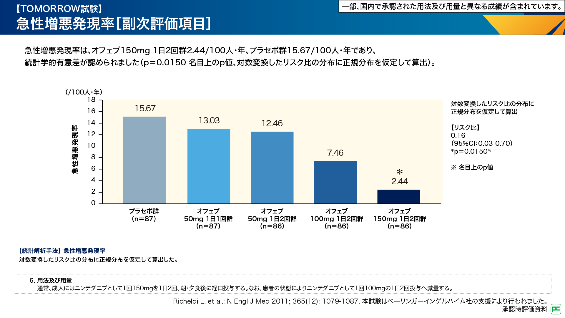副次評価項目である急性増悪発現率は、オフェブ150mg 1日2回群2.44/100人・年、プラセボ群15.67/100人・年であり、両群間に有意差が認められました(p=0.0150 名目上のp値、対数変換したリスク比の分布に正規分布を仮定して算出)(図5)。その他の用法・用量群では有意差はありませんでした6,7)。