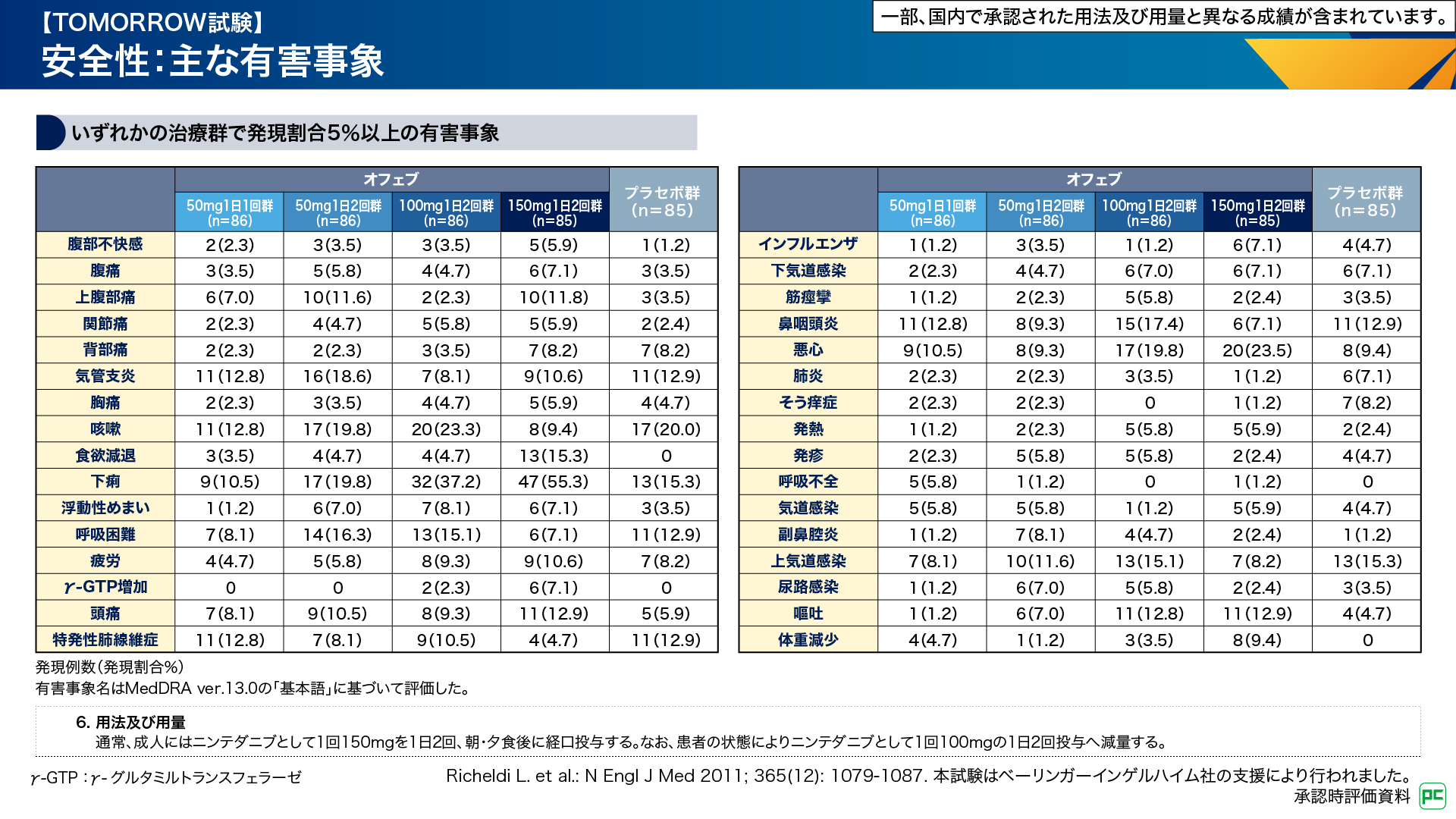 主な有害事象はオフェブ50mg 1日1回群では気管支炎、咳嗽、特発性肺線維症、鼻咽頭炎が各11例(12.8%)、50mg 1日2回群では咳嗽、下痢が各17例(19.8%)、気管支炎16例(18.6%)、100mg 1日2回群では下痢32例(37.2%)、咳嗽20例(23.3%)、悪心17例(19.8%)、150mg 1日2回群では下痢47例(55.3%)、悪心20例(23.5%)、食欲減退13例(15.3%)、などでした(図7)6,7)。