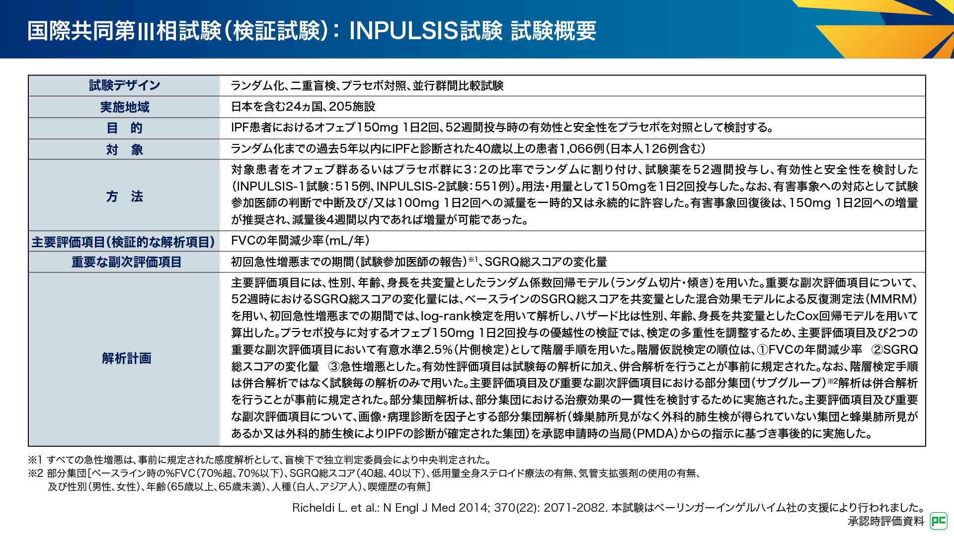 - Richeldi L. et al.: N Engl J Med 2014; 370(22): 2071-2082. 本試験はベーリンガーインゲルハイム社の支援により行われました。