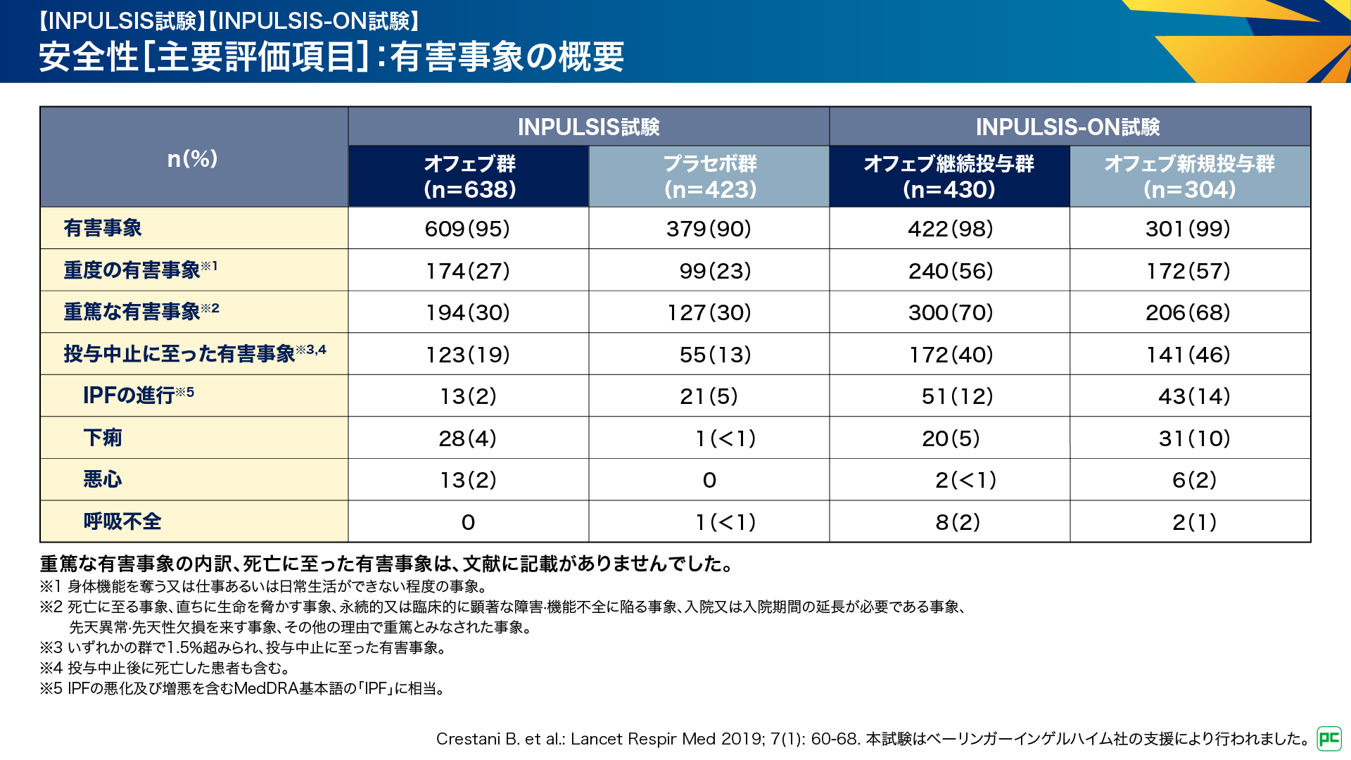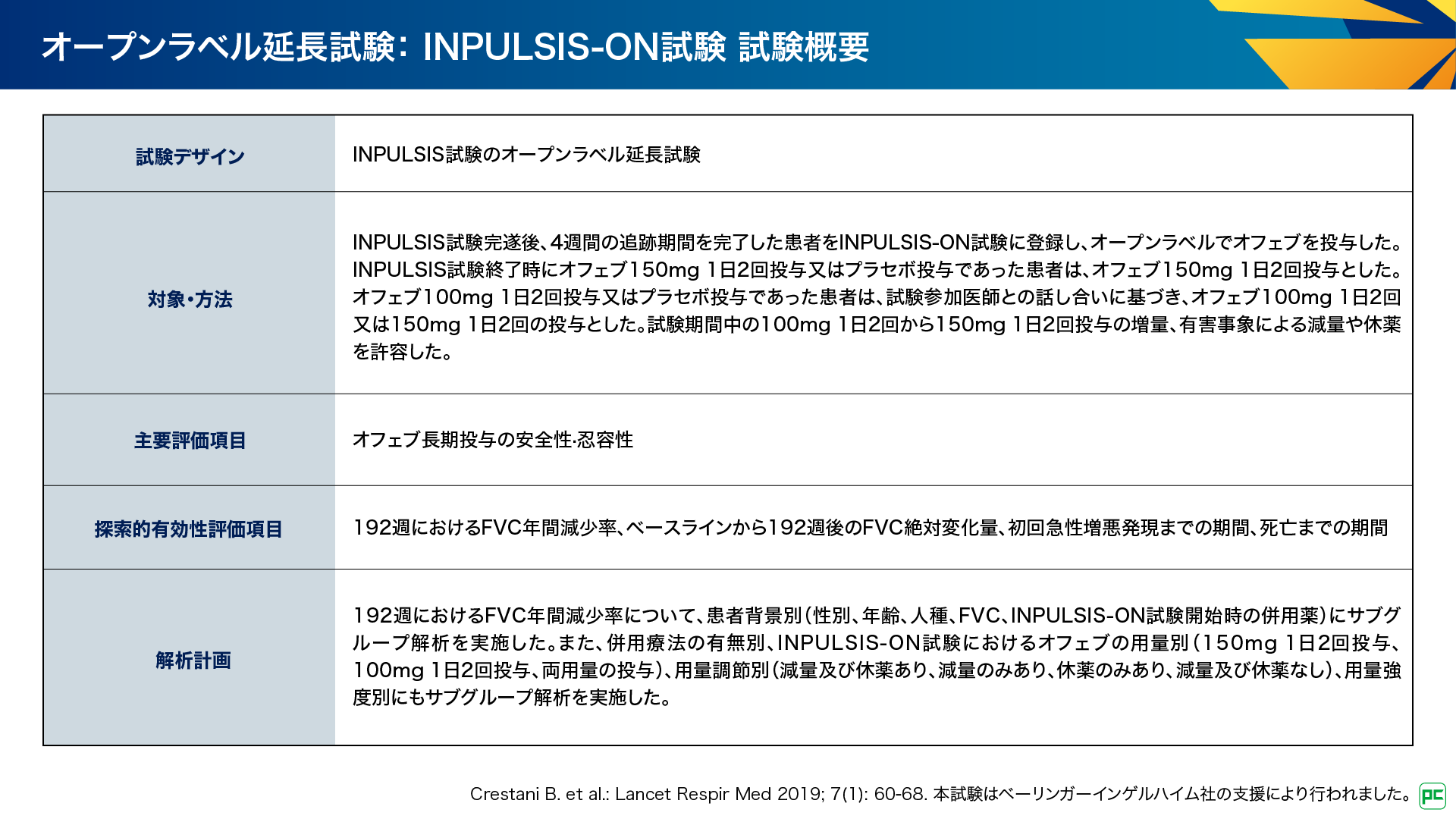 - Crestani B. et al.: Lancet Respir Med 2019; 7(1): 60-68. 本試験はベーリンガーインゲルハイム社の支援により行われました。