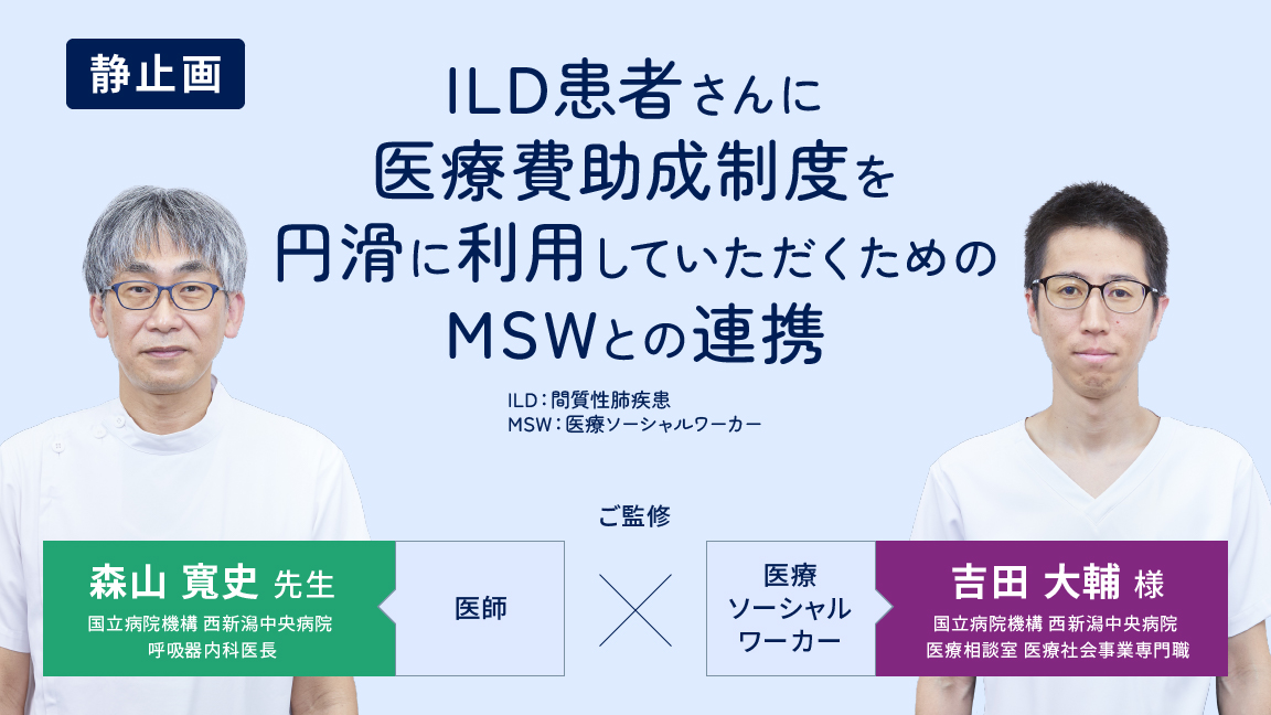 本コンテンツでは、ILD患者さんに医療費助成制度を円滑に利用していただくためのMSWとの連携について、国立病院機構 西新潟中央病院 呼吸器内科医長 森山 寬史先生と、同院 医療相談室 医療社会事業専門職 吉田 大輔様にうかがいます。