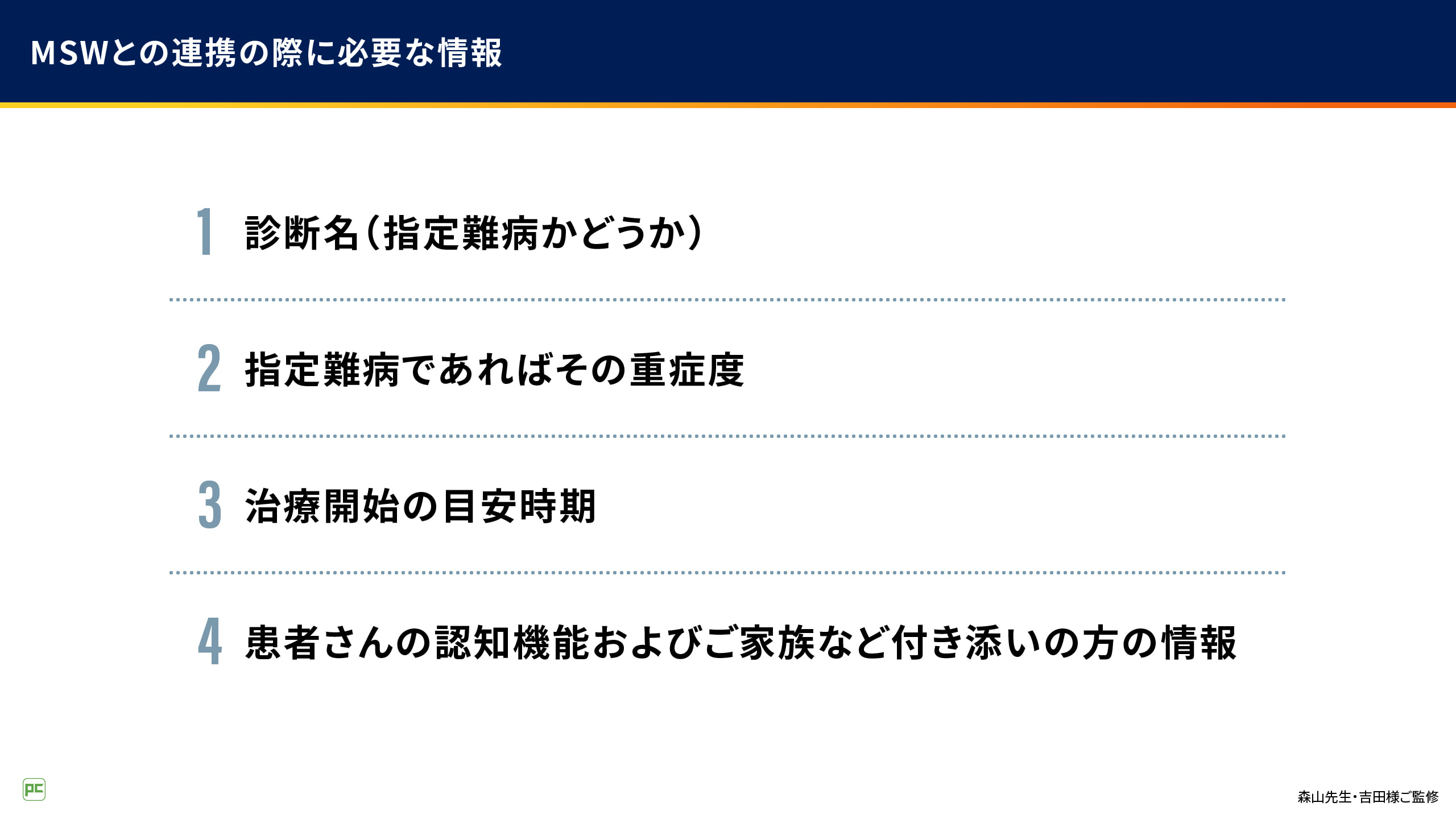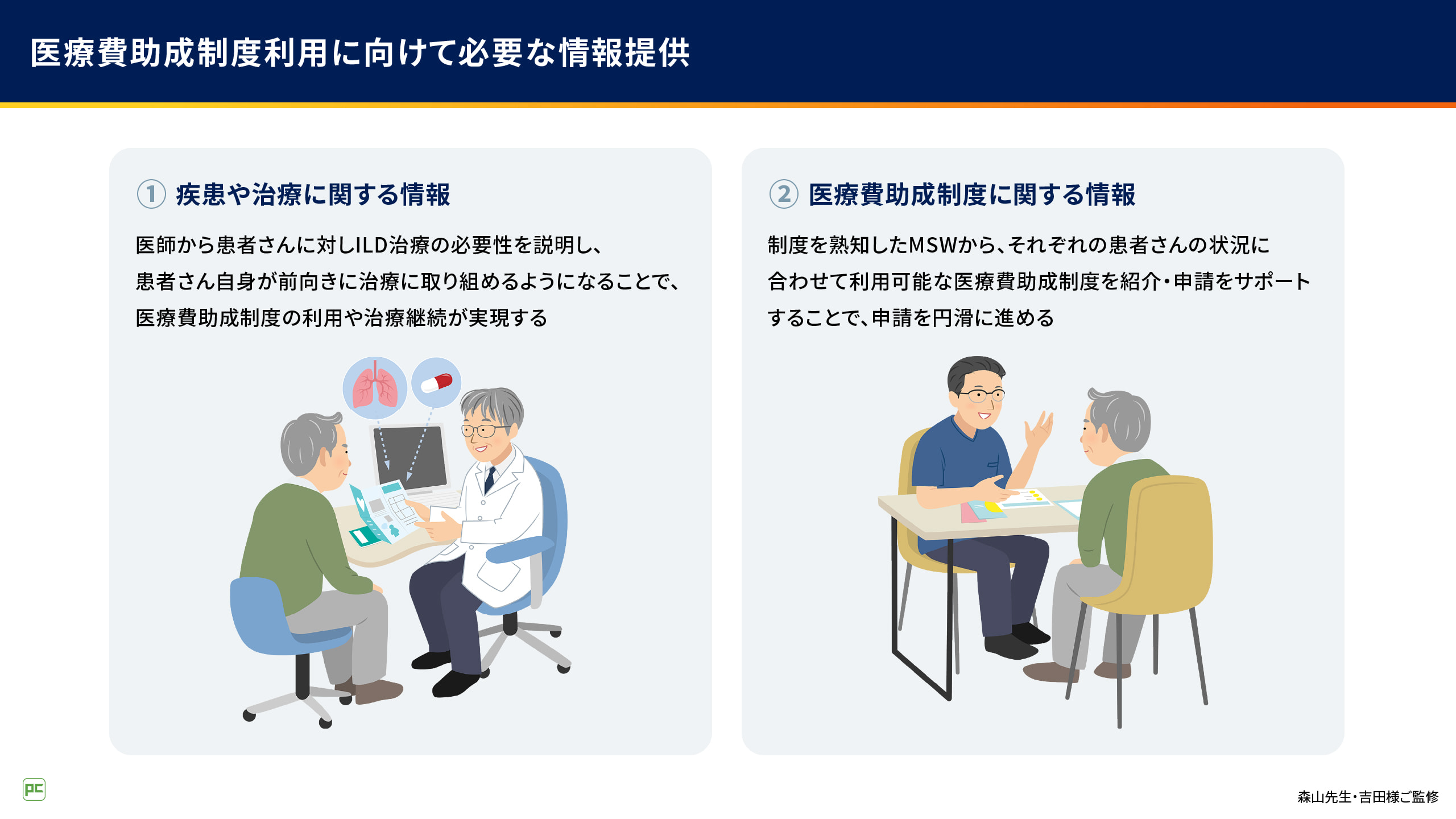 ①疾患や治療に関する情報と、②医療費助成制度に関する情報の2つを患者さんにお伝えすることが重要です。