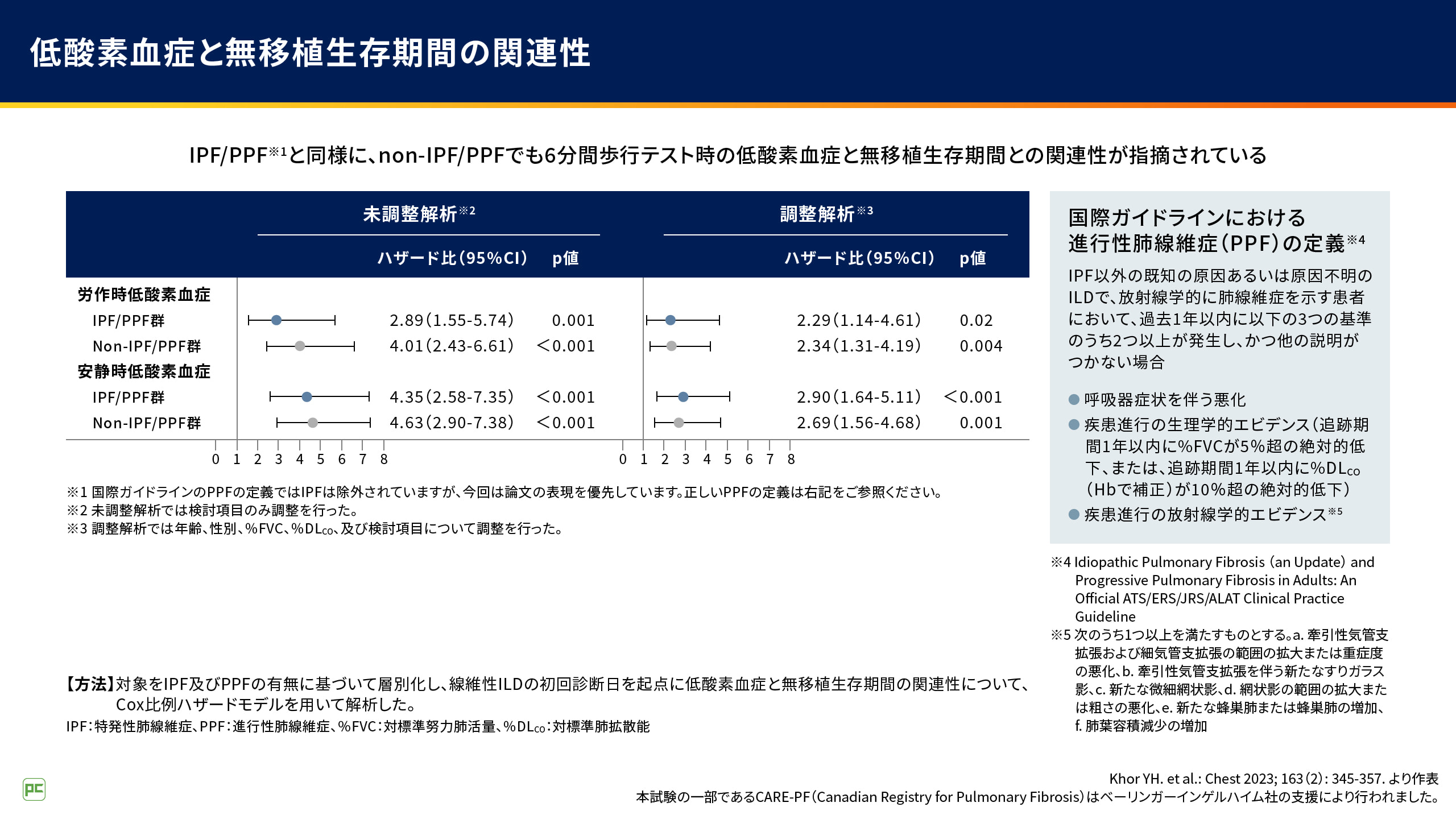 6分間歩行テストは、労作時の低酸素血症の発生有無を非侵襲的に調べることができるツールとして有用だと思っています。線維性ILD患者さんを対象とした研究で6分間歩行テスト時の低酸素血症と無移植生存期間との関連性が報告されていますので、患者さんの生命予後を予測することに役立てることができます(図1)。