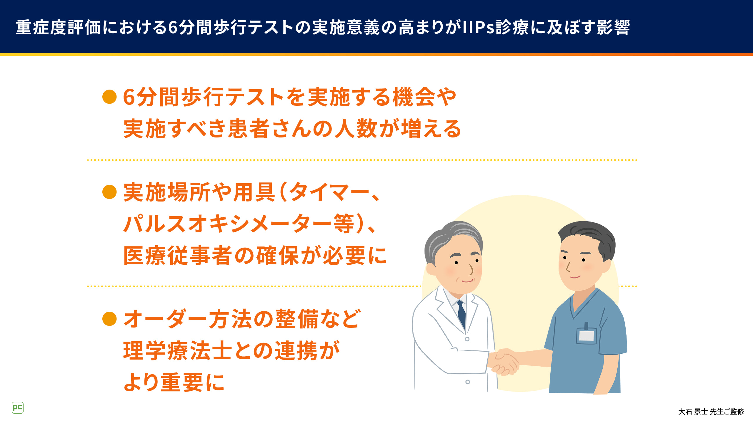 Q 重症度評価における6分間歩行テストの実施意義が高まったことは、IIPs診療にどのような影響を及ぼすと考えられるでしょうか?