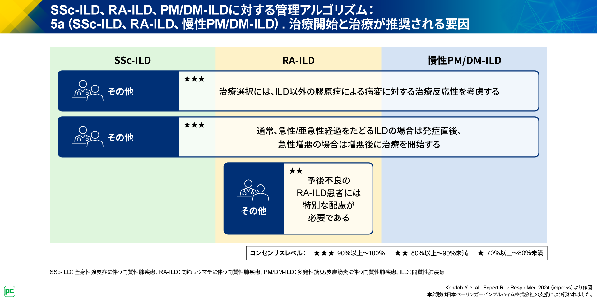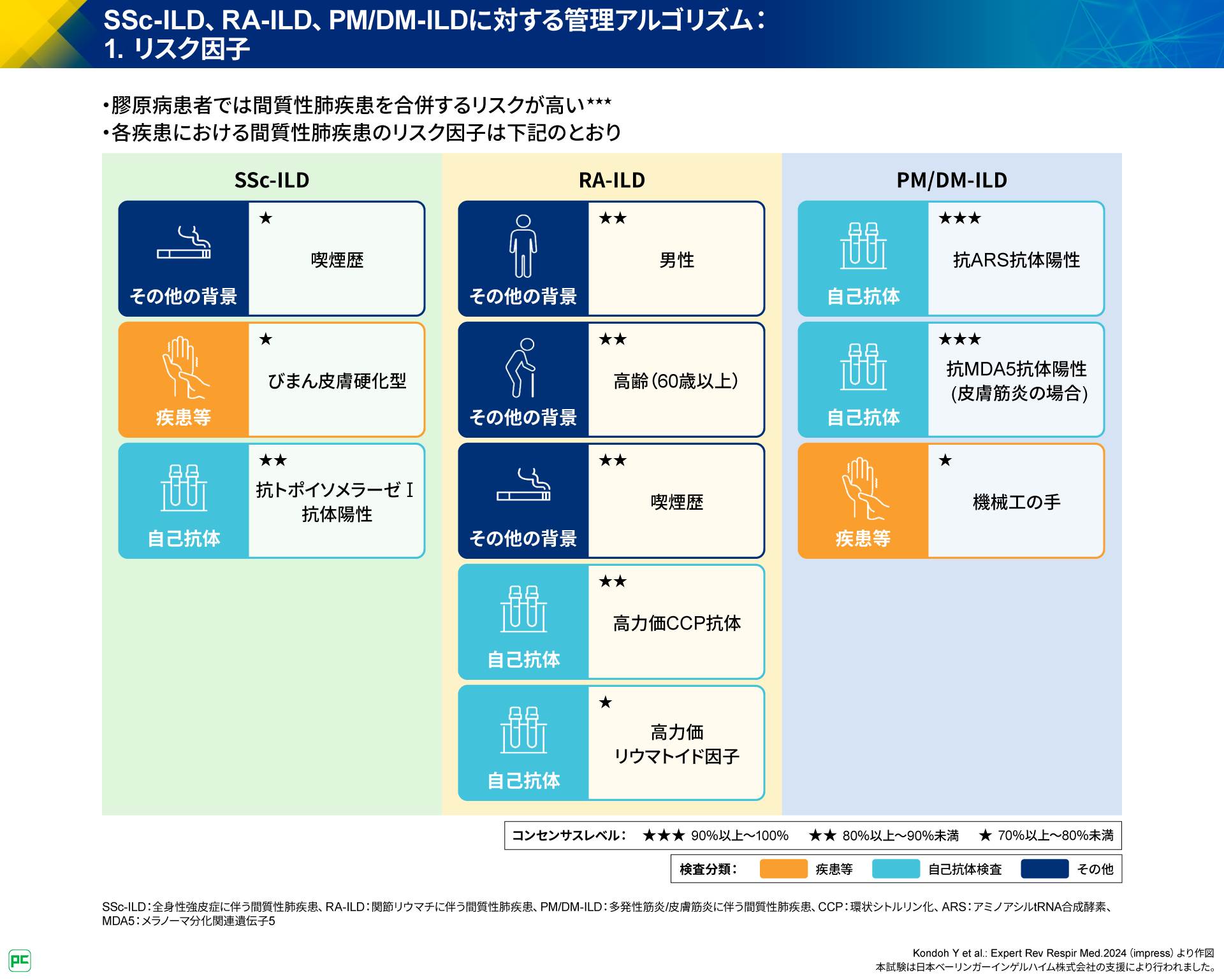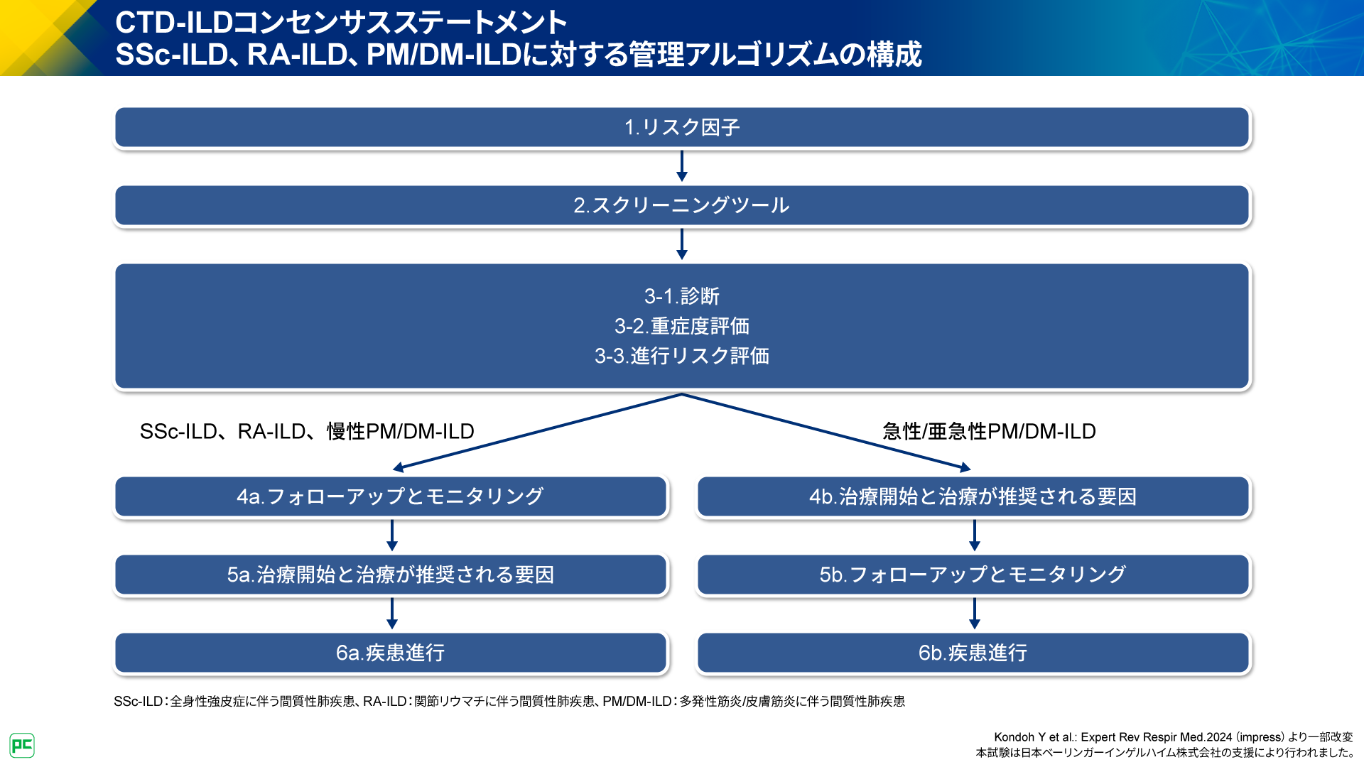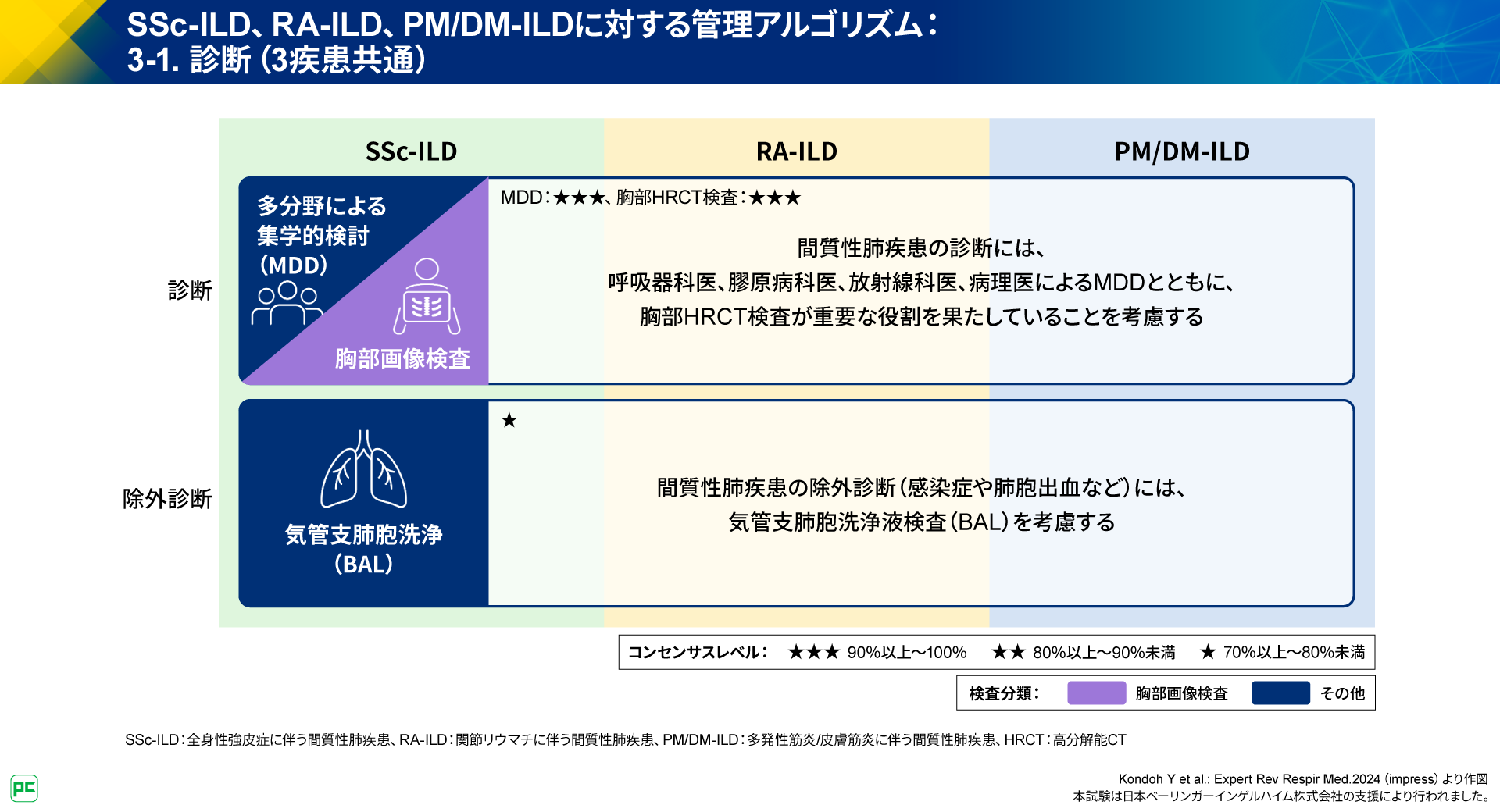 本アルゴリズムでは、SSc-ILD、RA-ILD、PM/DM-ILDの管理において共通する内容と疾患特異的な内容がまとめられています。