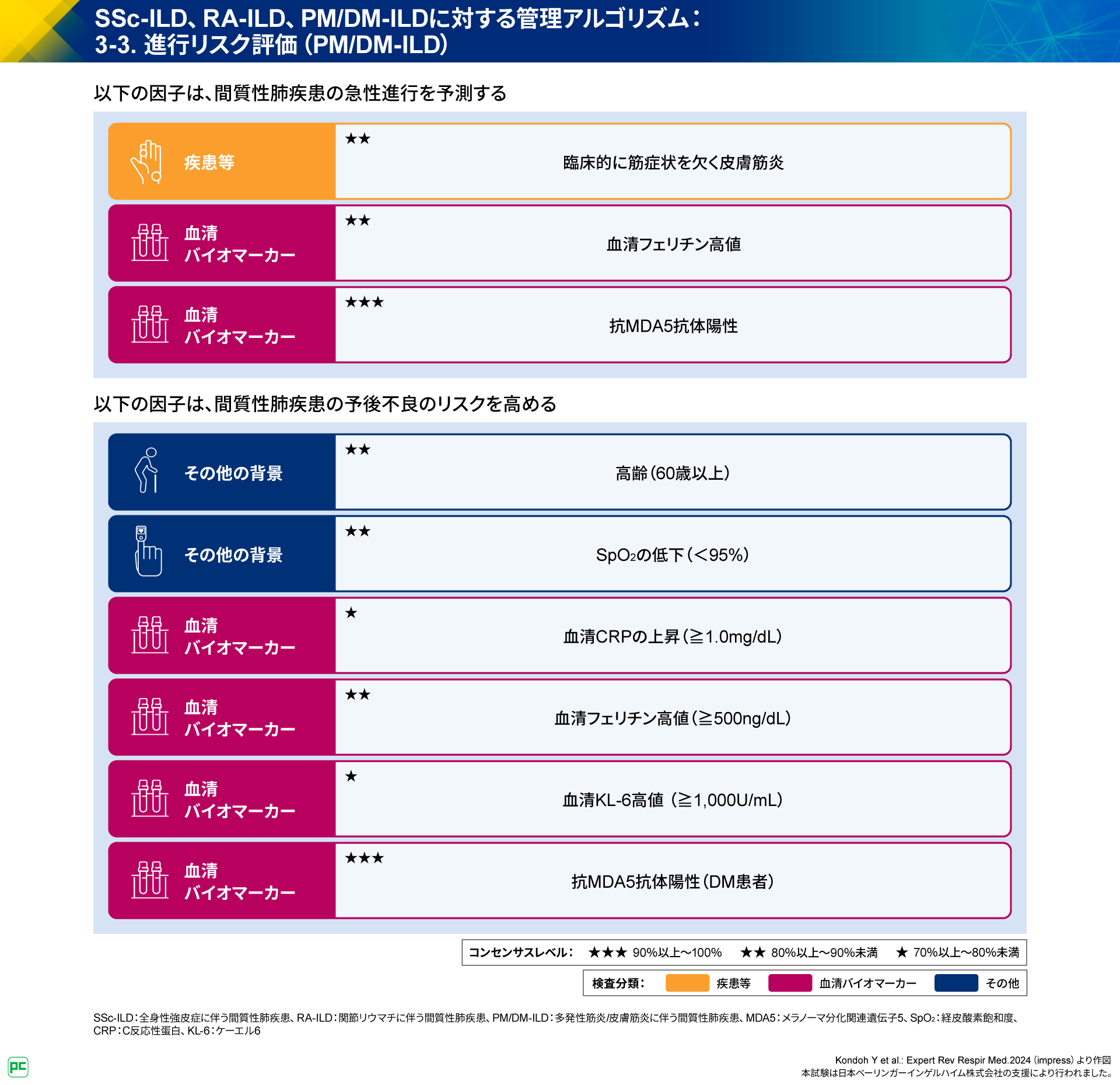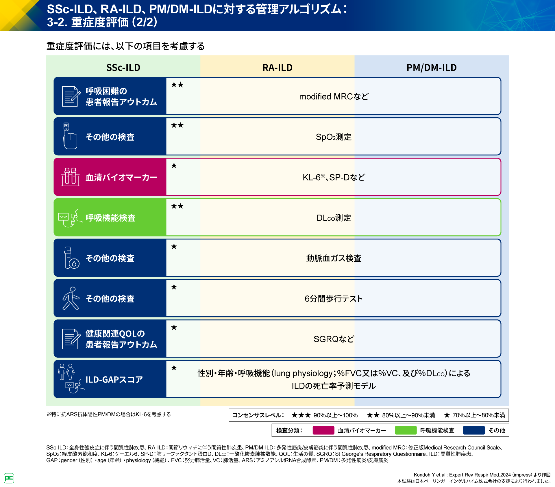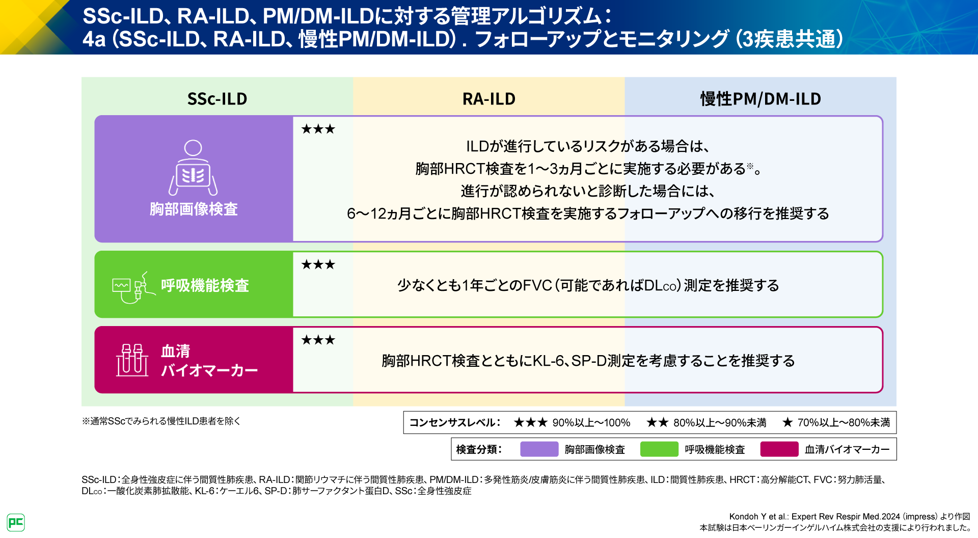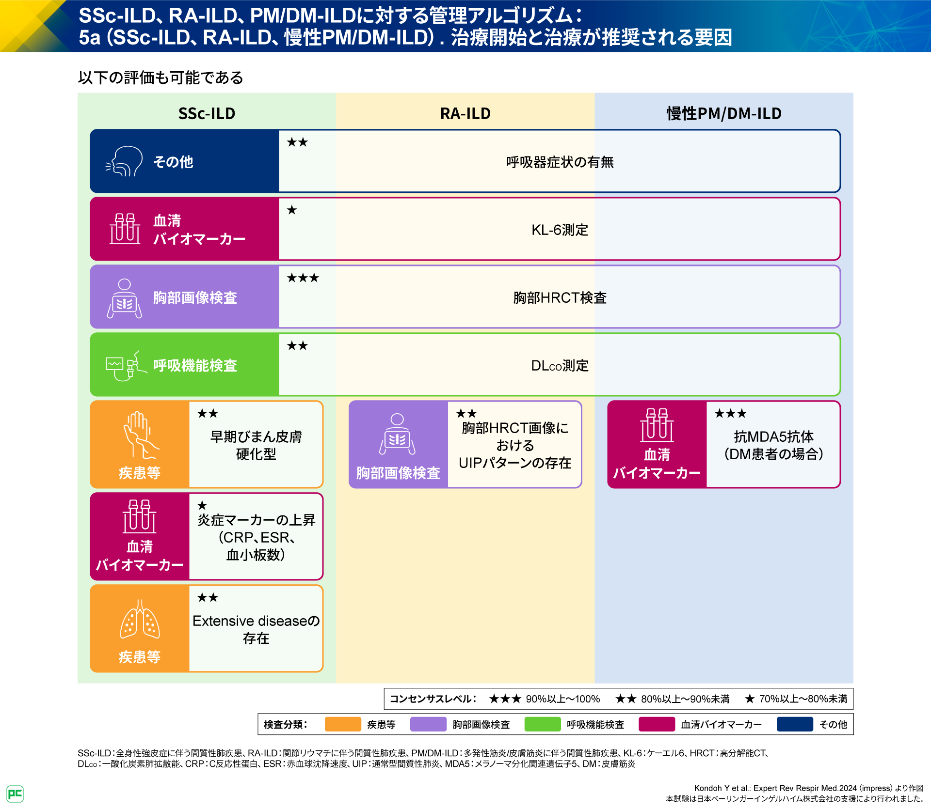 本アルゴリズムでは、SSc-ILD、RA-ILD、PM/DM-ILDの管理において共通する内容と疾患特異的な内容がまとめられています。
