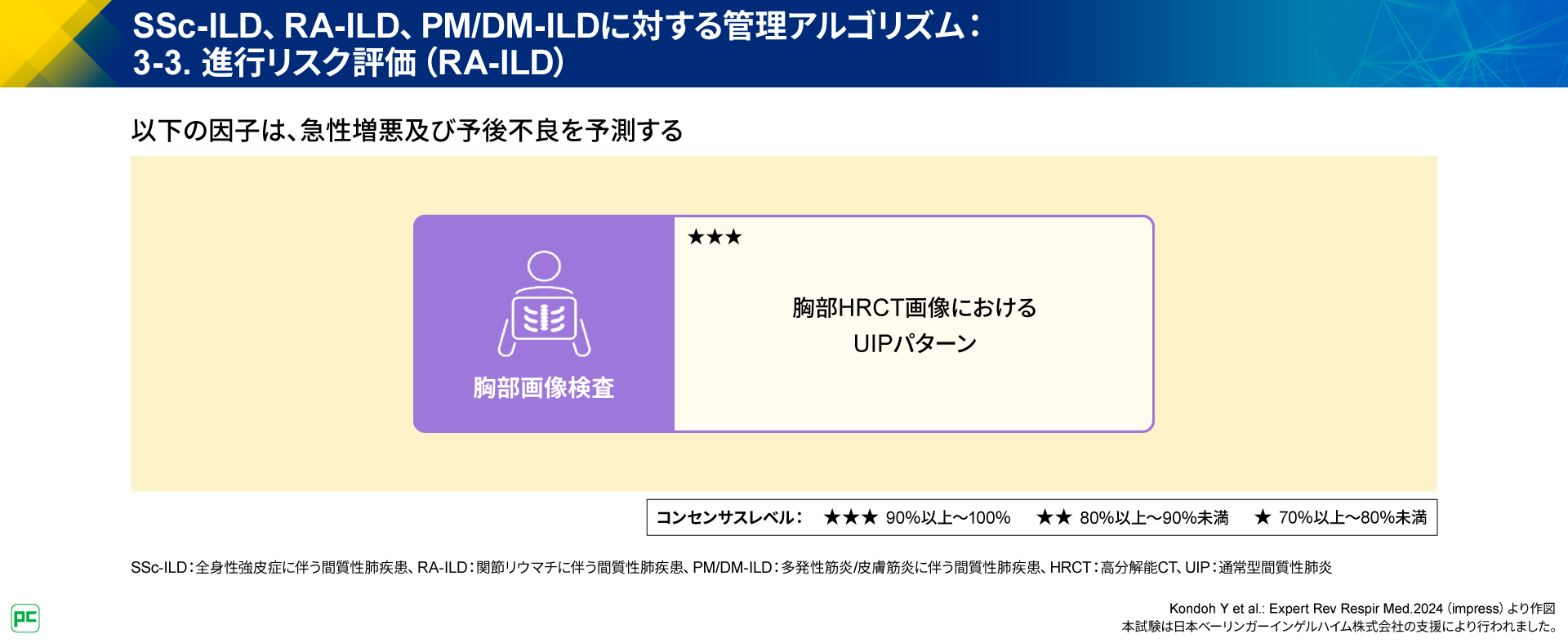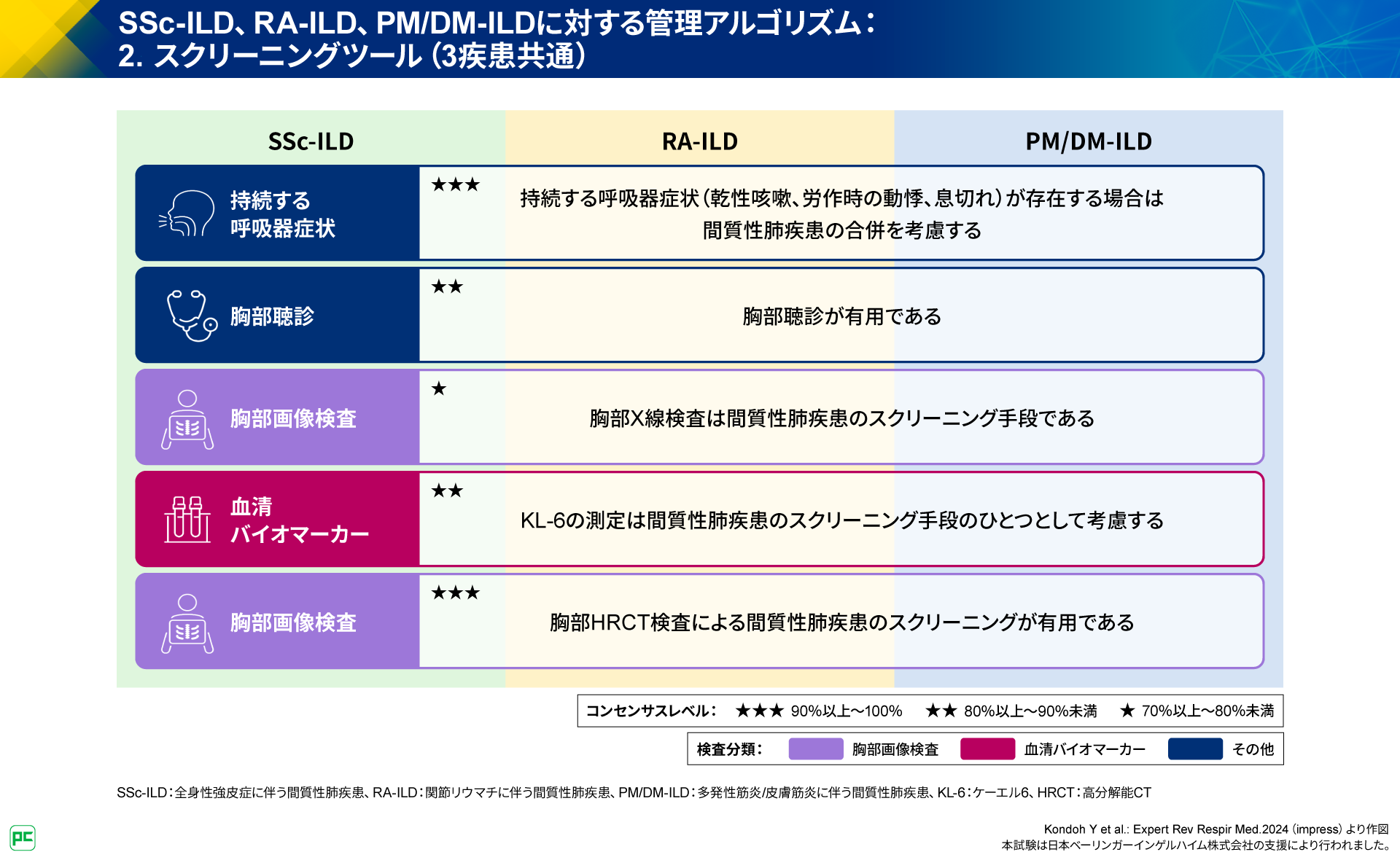 CTD-ILDコンセンサスステートメント 疾患別管理アルゴリズムでは、CTD-ILDのスクリーニングや診断のための項目が網羅的にまとめられています。SSc-ILD、RA-ILD、PM/DM-ILDに共通する項目だけでなく疾患別の項目もまとめられていますので、日本国内の実臨床において活用しやすくなっているのではないでしょうか。