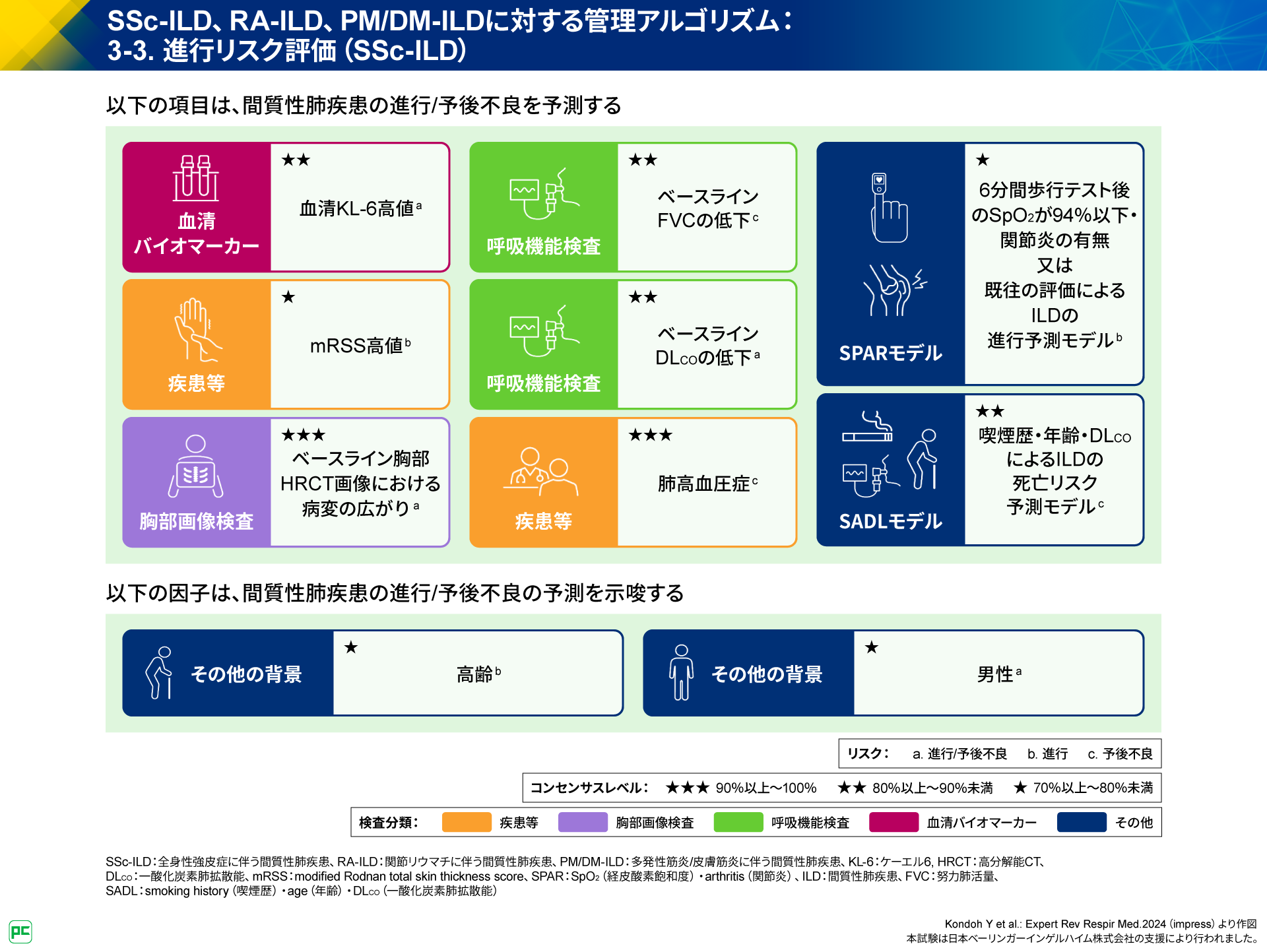 SSc-ILDでは、進行/予後不良を予測する項目として、血清KL-6高値、ベースライン胸部HRCT画像における病変の広がり、ベースラインDLcoの低下が挙げられています。