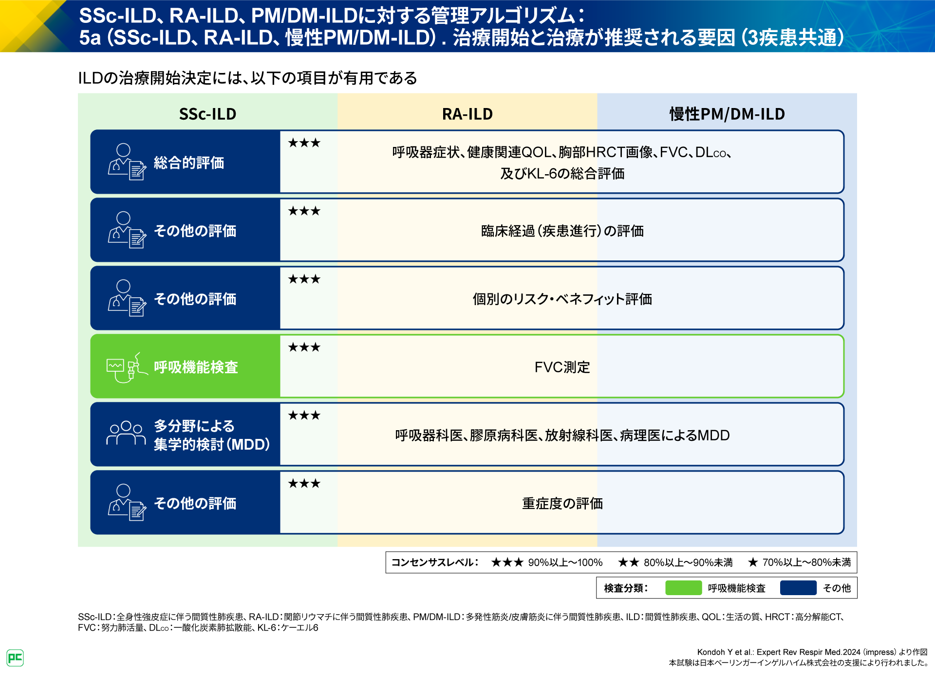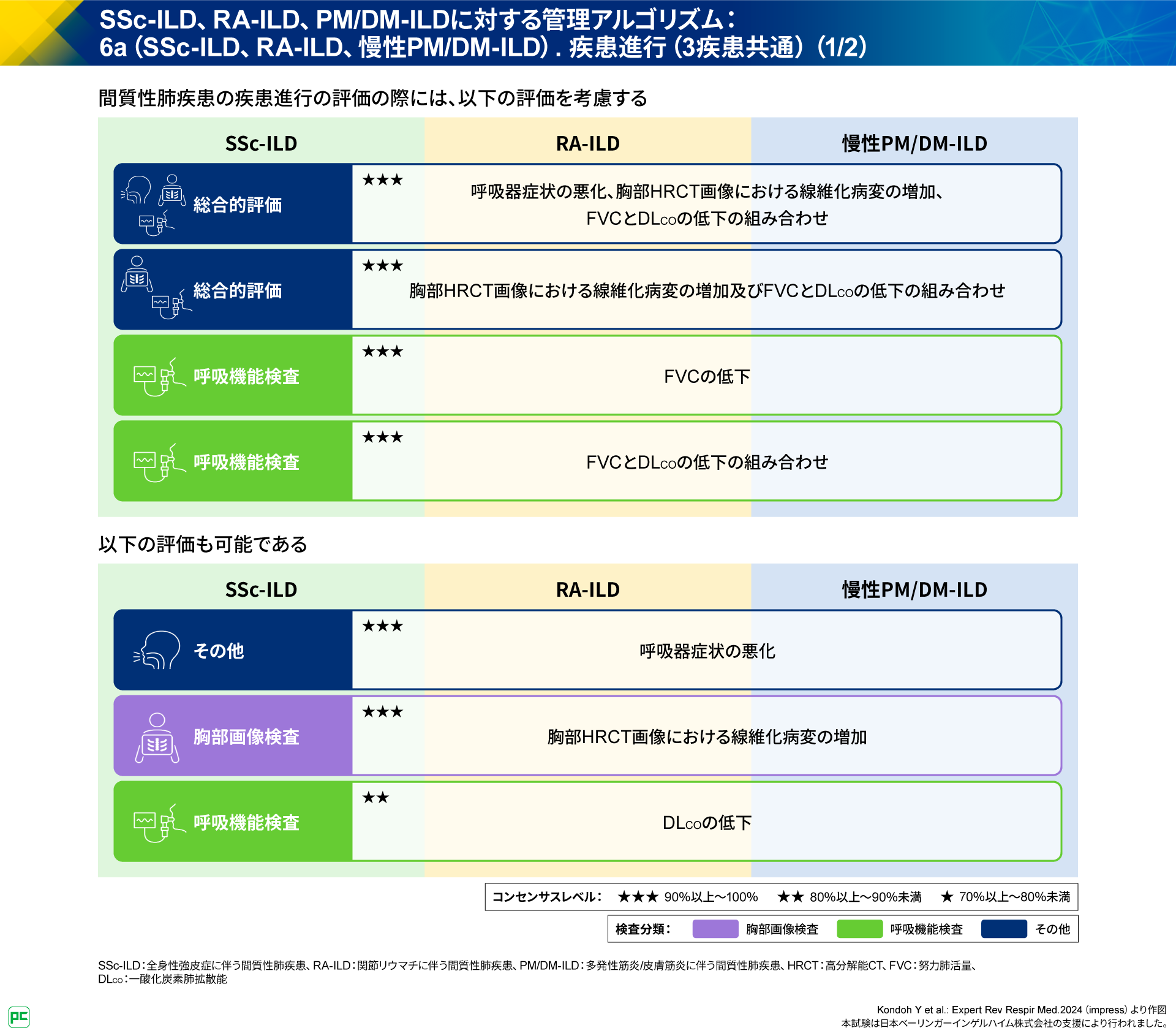 SSc-ILD、RA-ILD、慢性PM/DM-ILDに共通する、ILDの疾患進行の評価の際に考慮する項目として、「呼吸器症状の悪化、胸部HRCT画像における線維化病変の増加、FVCとDLcoの低下の組み合わせ」などのいくつかの検査を組み合わせた評価やFVCの低下が挙げられています。