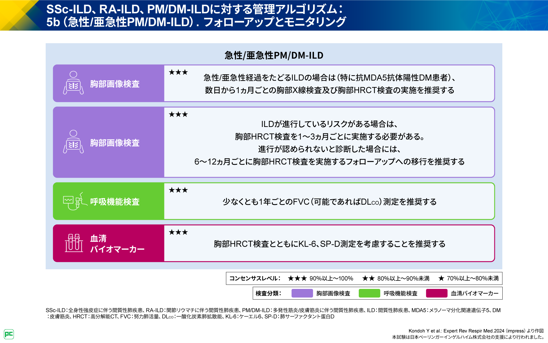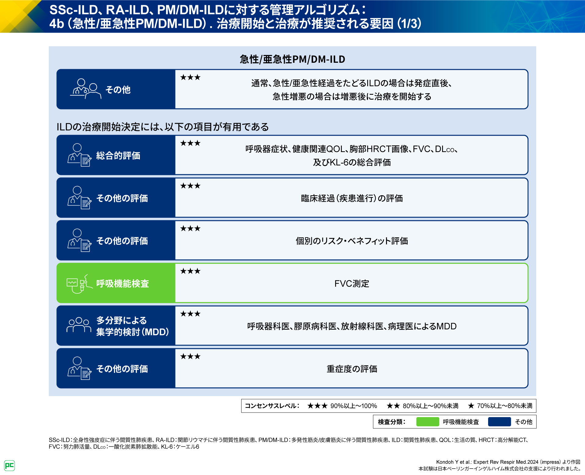 SSc-ILD、RA-ILD、慢性PM/DM-ILDについては、「4a. フォローアップとモニタリング」「5a .治療開始と治療が推奨される要因」「6a. 疾患進行」の順に紹介されています。一方で、急性/亜急性PM/DM-ILDについては、発症早期に治療介入が必要であることが考慮され、「4b. 治療開始と治療が推奨される要因」「5b. フォローアップとモニタリング」「6b. 疾患進行」の順に紹介されています(図1)。