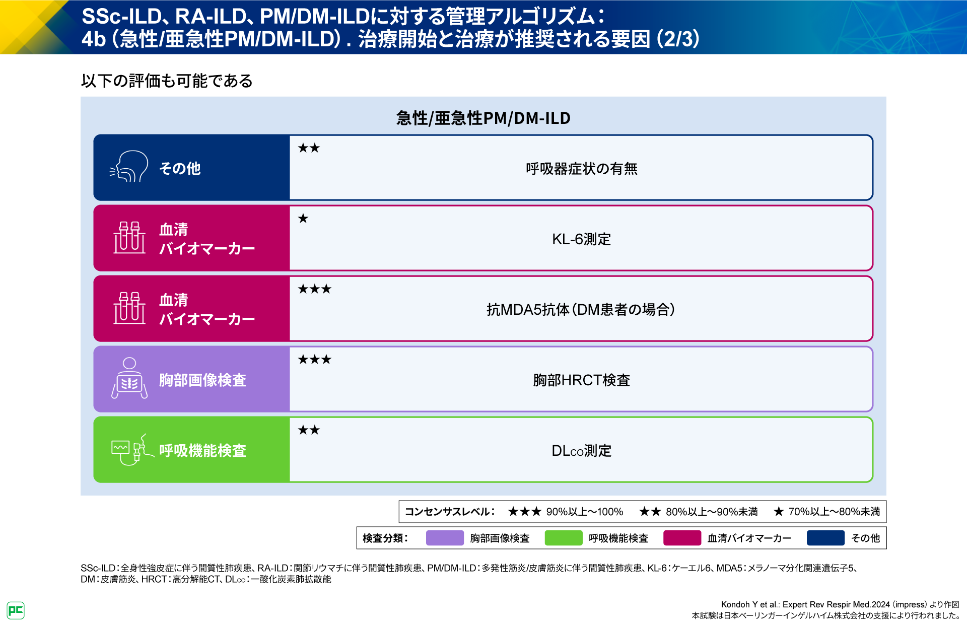 さらに、SSc-ILD、RA-ILD、慢性PM/DM-ILDに共通する、治療開始の評価が可能な項目として、呼吸器症状の有無の確認やKL-6の測定、胸部HRCT検査、DLcoの測定が挙げられています。