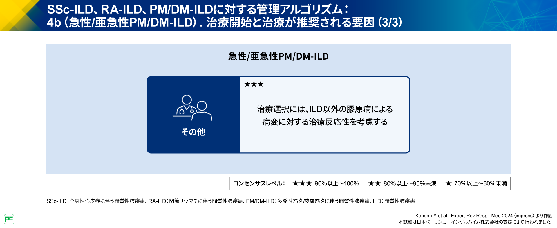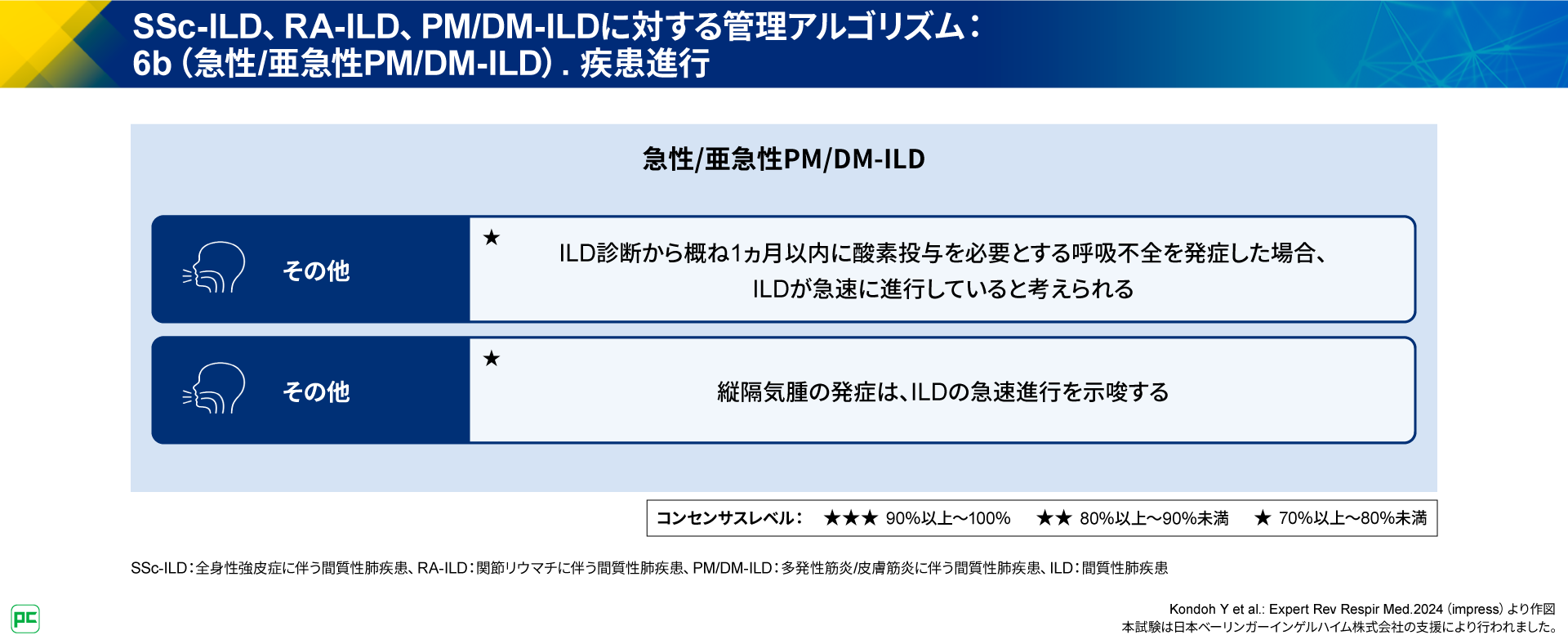 次に、「SSc-ILD、RA-ILD、慢性PM/DM-ILD」と「急性/亜急性PM/DM-ILD」に分けて提示されています。