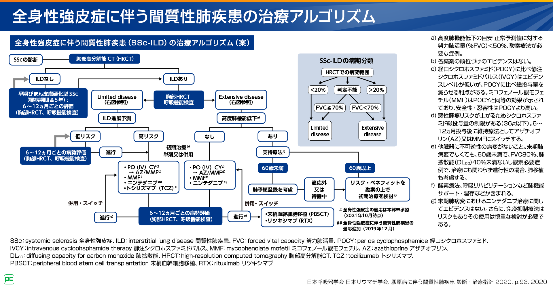SSc患者さんでILDありと診断された場合は胸部HRCT所見と呼吸機能検査によってLimited diseaseあるいはExtensive diseaseに病期分類を行います。