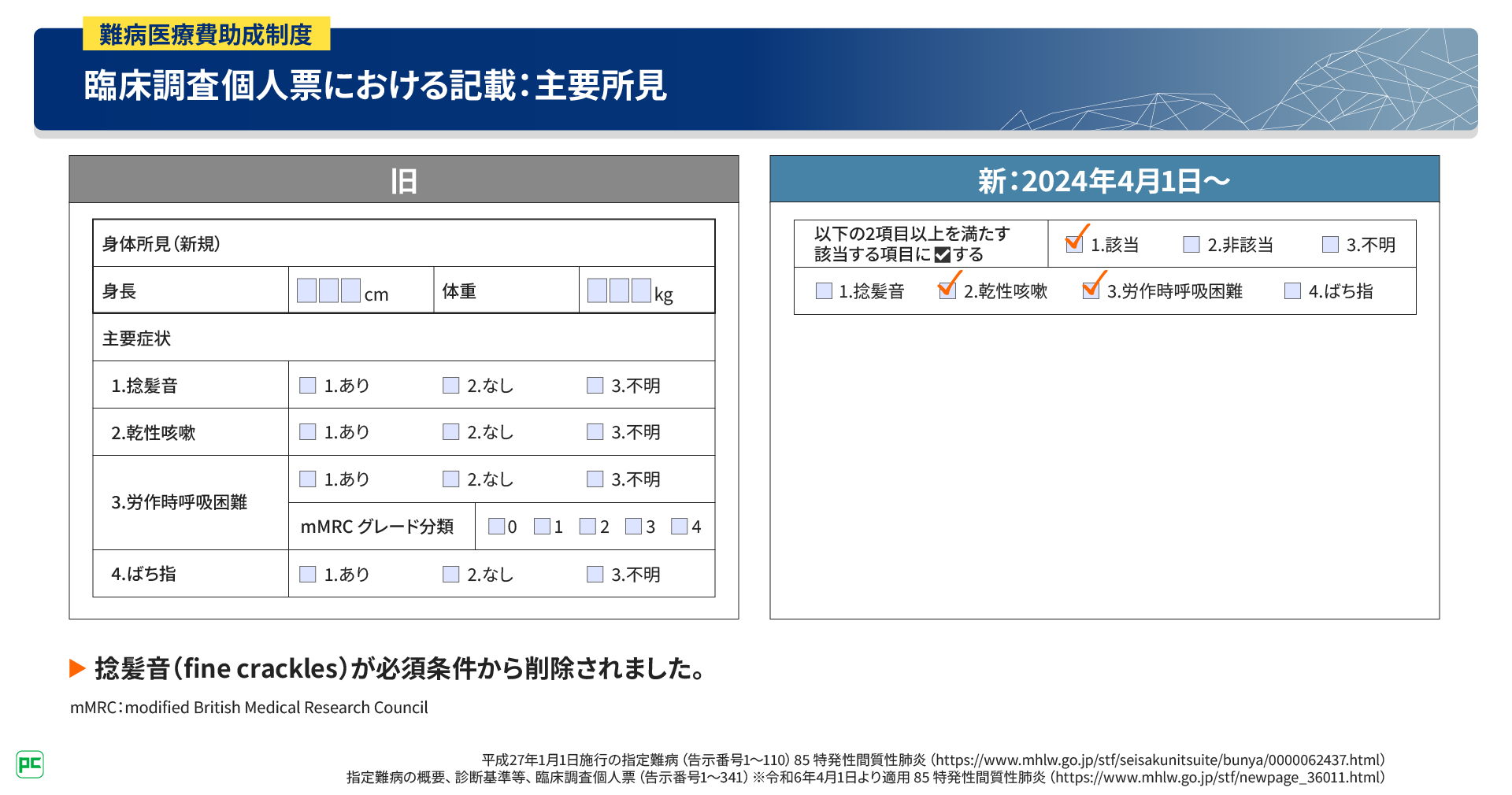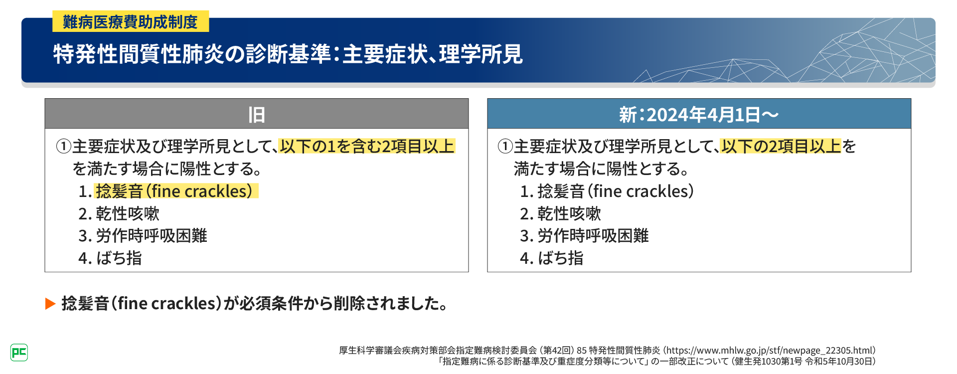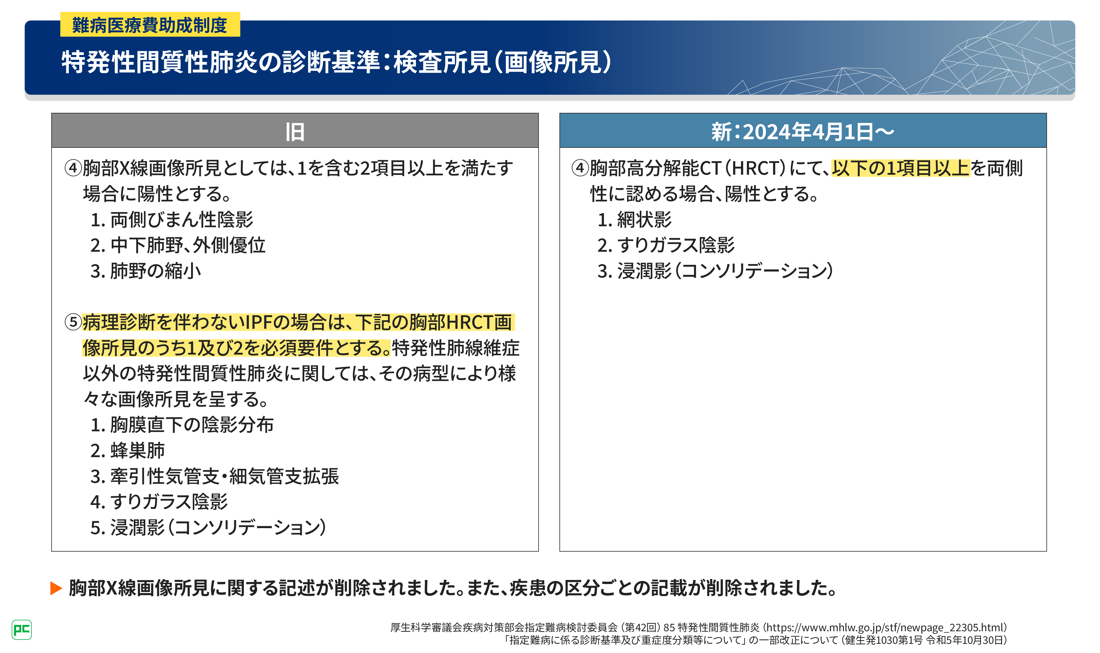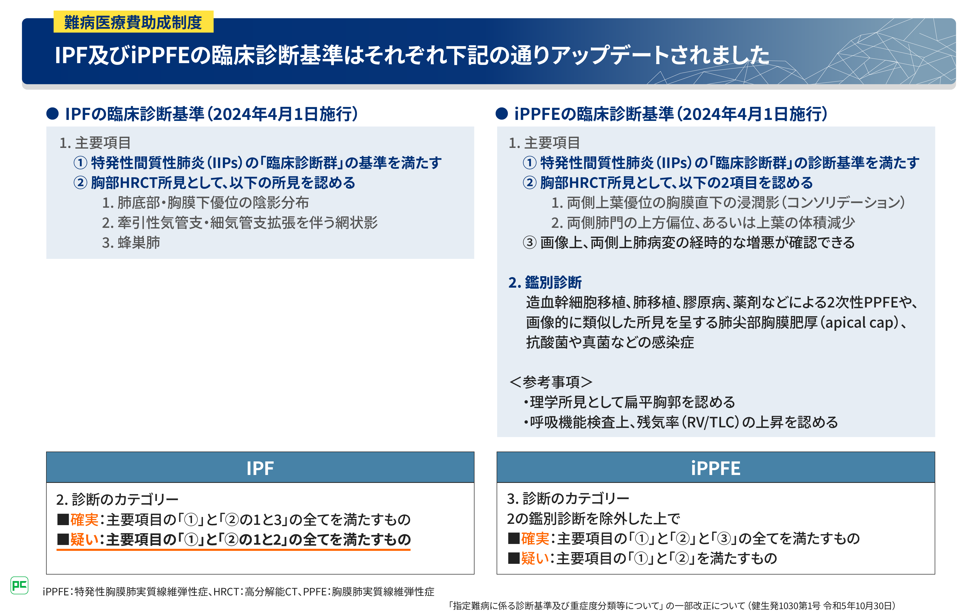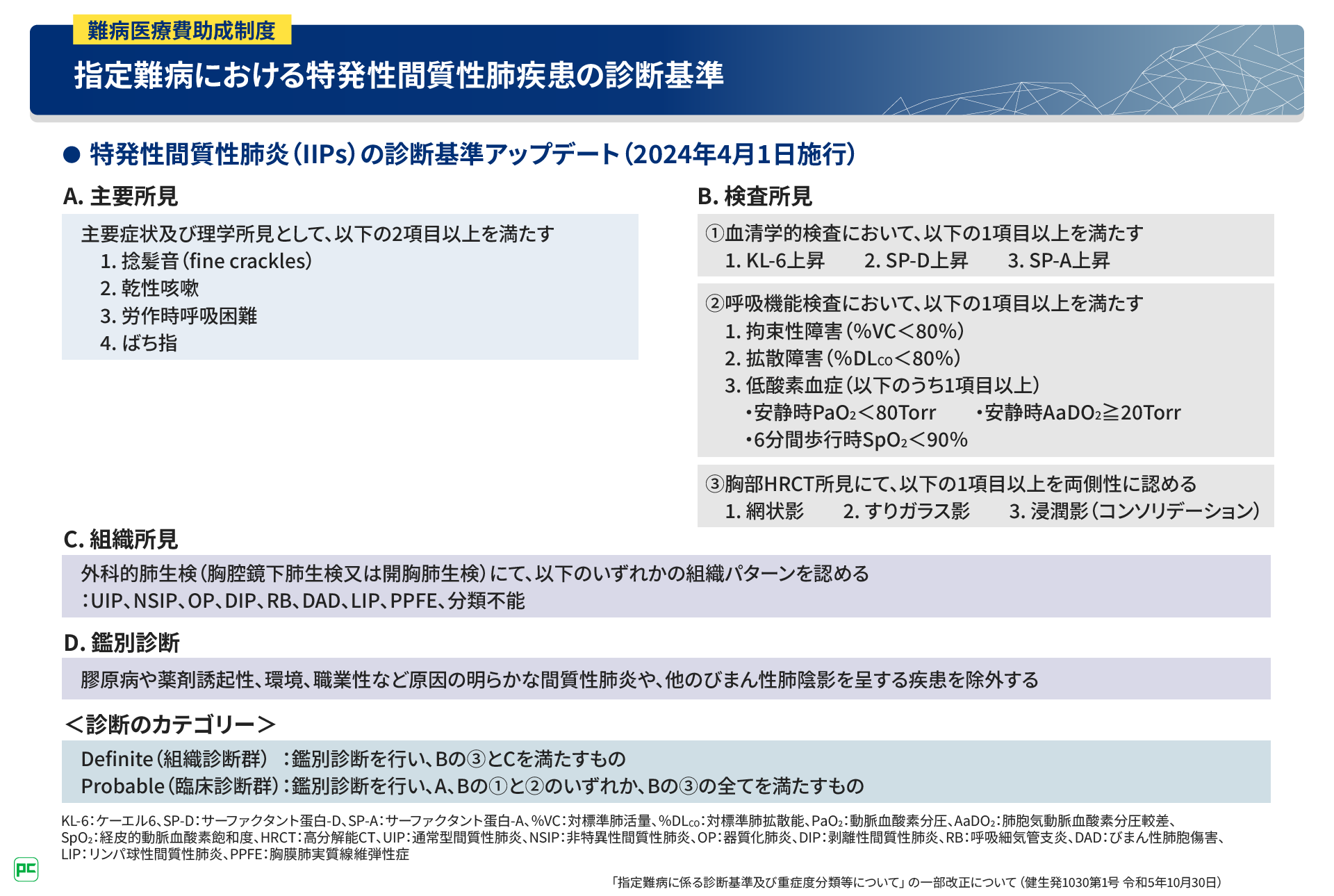 ● 2024年4月の指定難病診断基準のアップデートにより、特発性間質性肺炎の診断基準・重症度分類が変更された