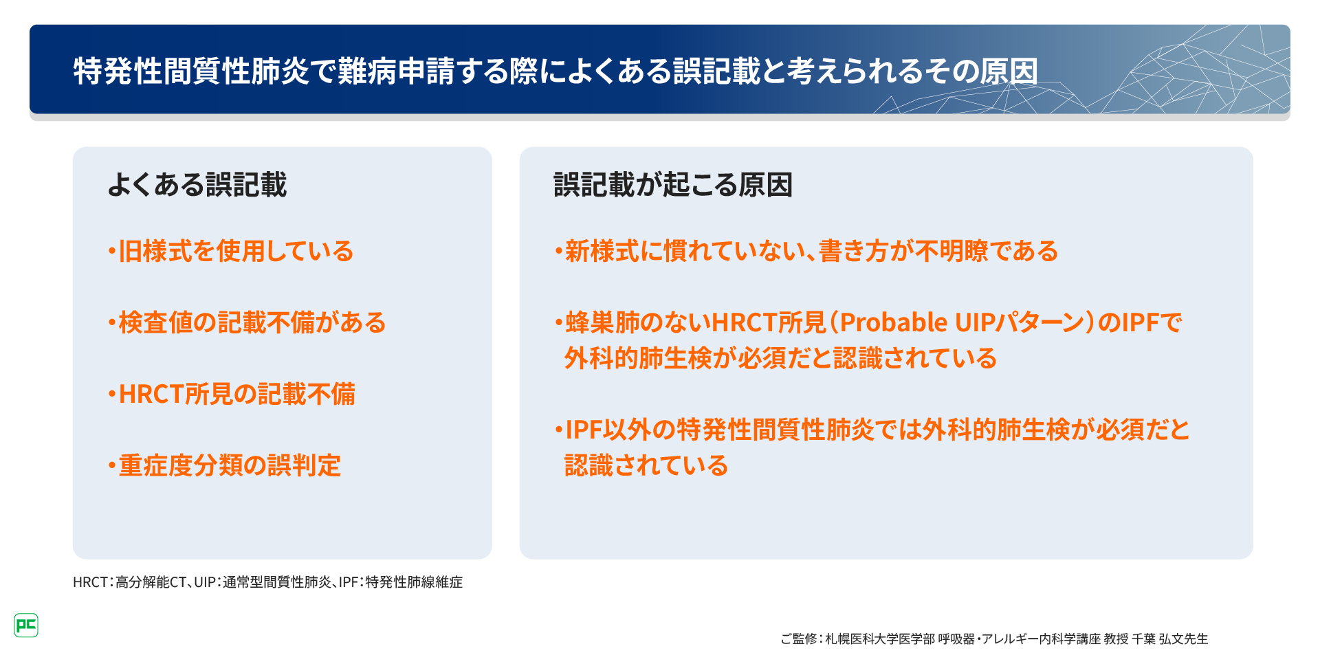 よくある間違いとして、旧様式の臨床調査個人票を使用しているケースがあります。また、新様式を使用していても、従来の基準から変更された箇所は間違いやすい部分です。具体的には、検査値やHRCT所見の記載方法を誤っているケース、重症度分類の判定を誤っているケースなどがあります。また、HRCT所見で蜂巣肺のない、Probable UIPパターンのIPFや、IPFではないIIPsでは外科的肺生検が必須だと誤って認識されていることがあります(図3)。