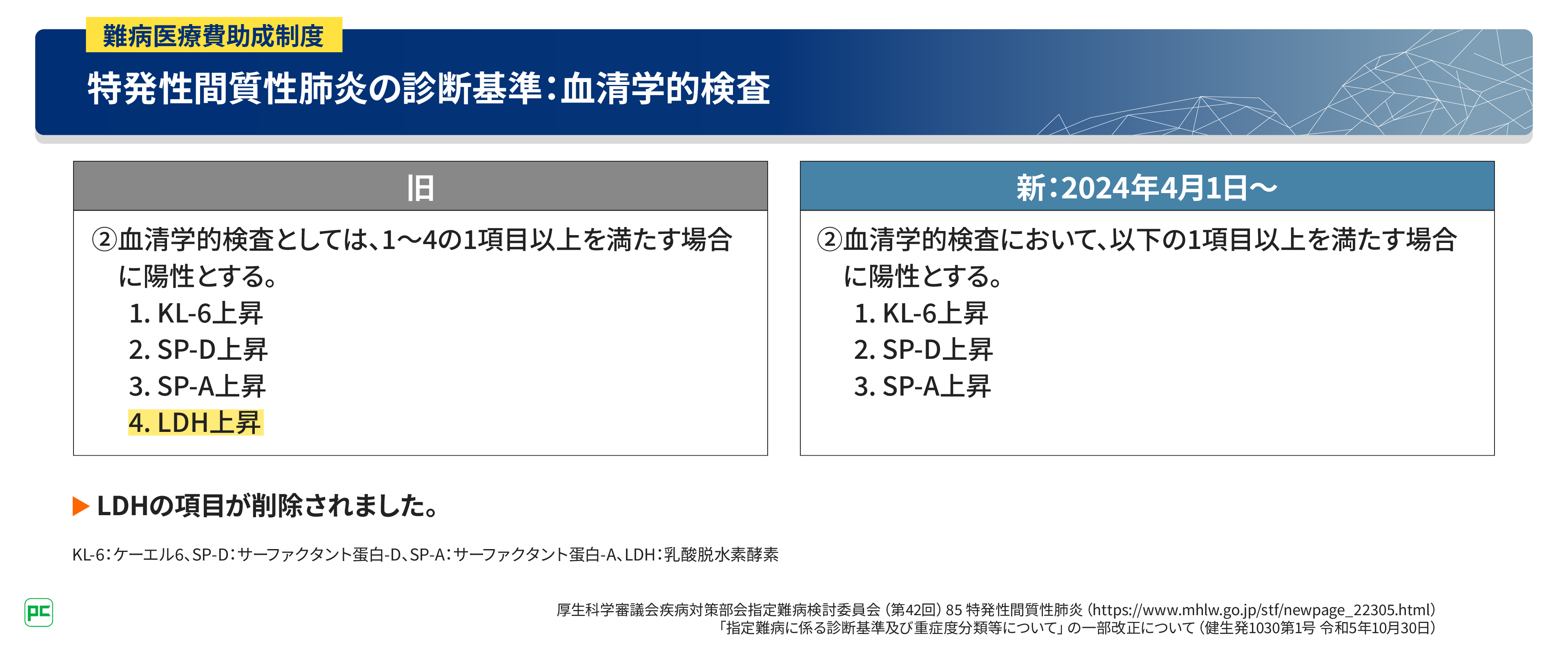 続いて、血清学的検査についてです。以前は、KL-6、SP-D、SP-A、LDHのいずれかの上昇を満たす場合に陽性と判定されていましたが、新基準では、LDHが削除され、KL-6、SP-D、SP-Aのいずれかの上昇を満たす場合に陽性と判定されます(図7)。