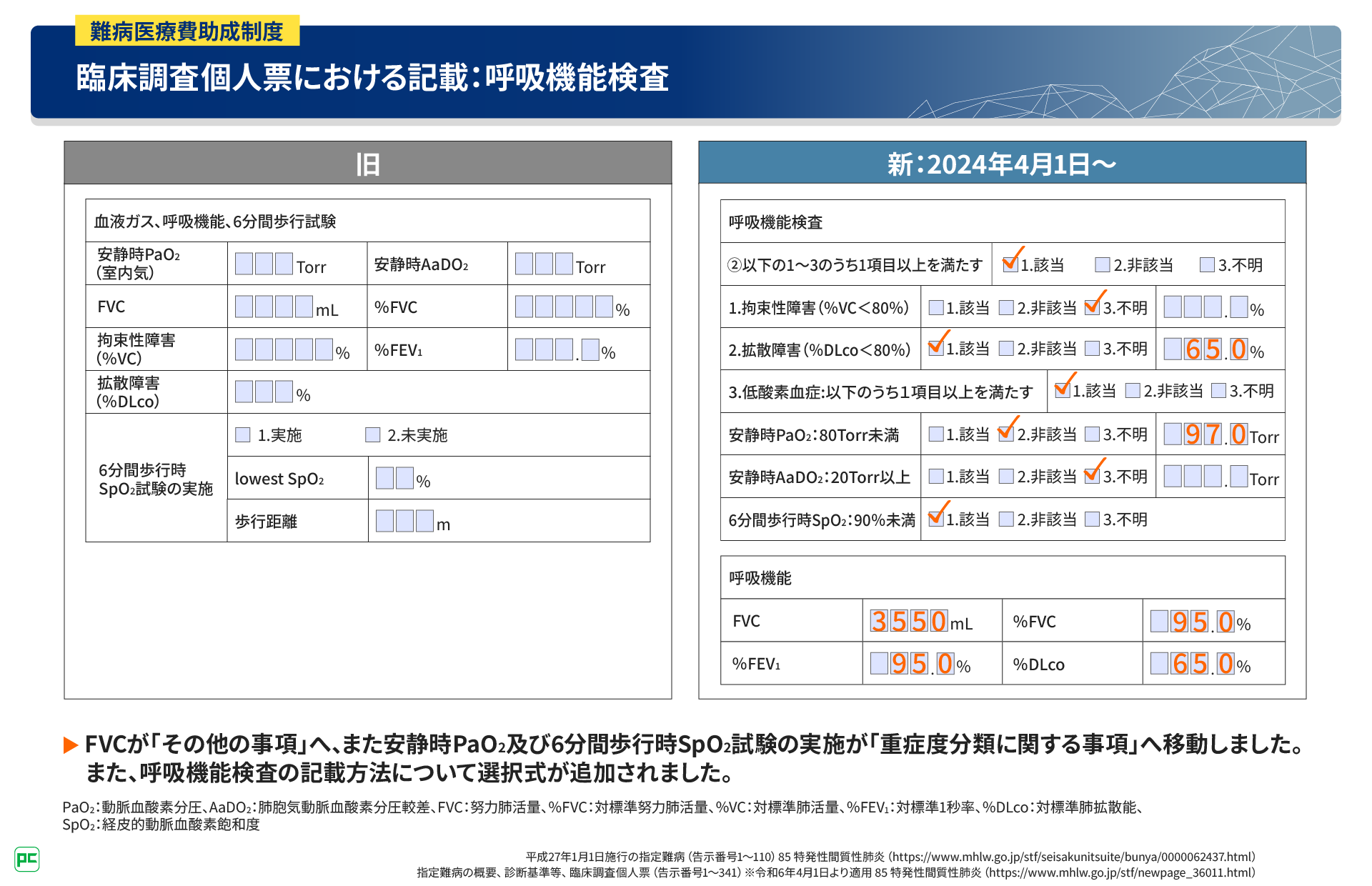 臨床調査個人票においては、呼吸機能検査の結果に「該当」「非該当」「不明」選択式が追加されました。FVCの記載欄は「その他の事項」へ、「6分間歩行時SpO2試験の実施」は「重症度分類に関する事項」へ移動しています。