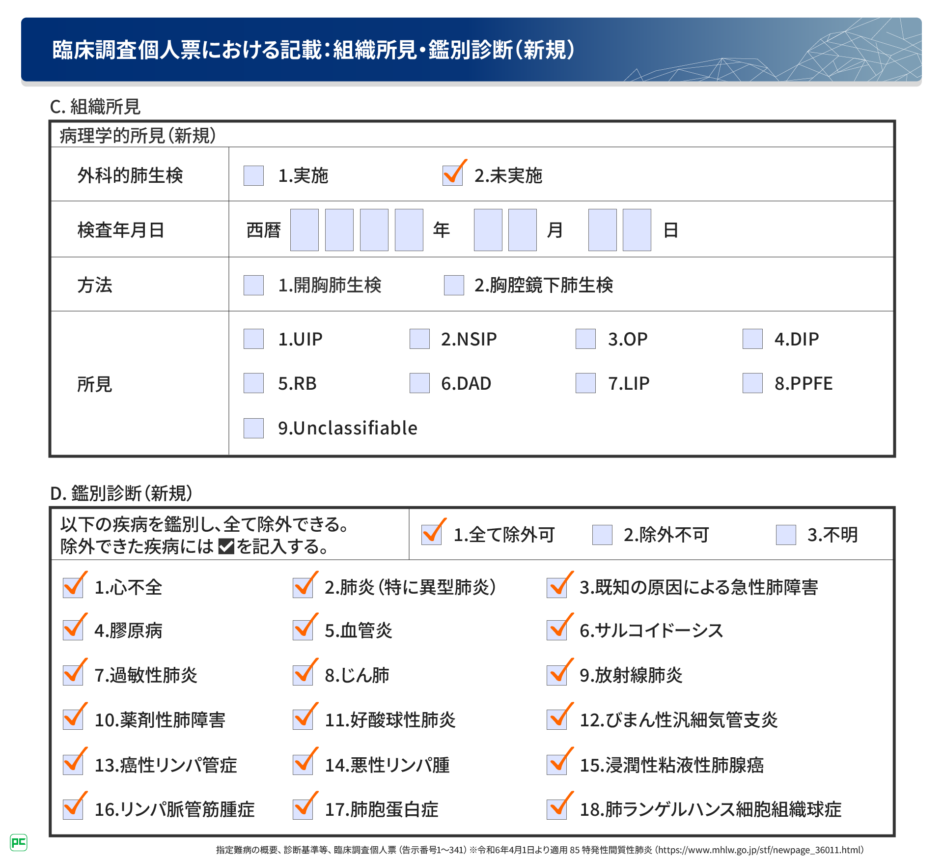 続いて、組織所見と鑑別診断についてです。臨床調査個人票におけるこれらの記載項目は、以前の内容から大きく変更ありません。