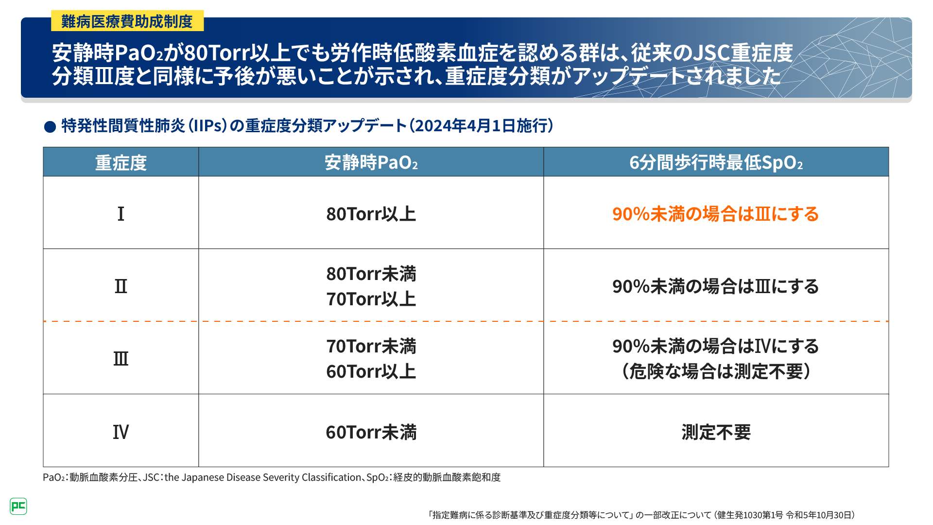 今回の症例は、安静時PaO2 80Torr以上のため、従来の基準では重症度Ⅰ度となりますが、6分間歩行時最低SpO2 90%未満のため、新たな基準ではⅢ度となり、医療費助成の申請が可能になります。