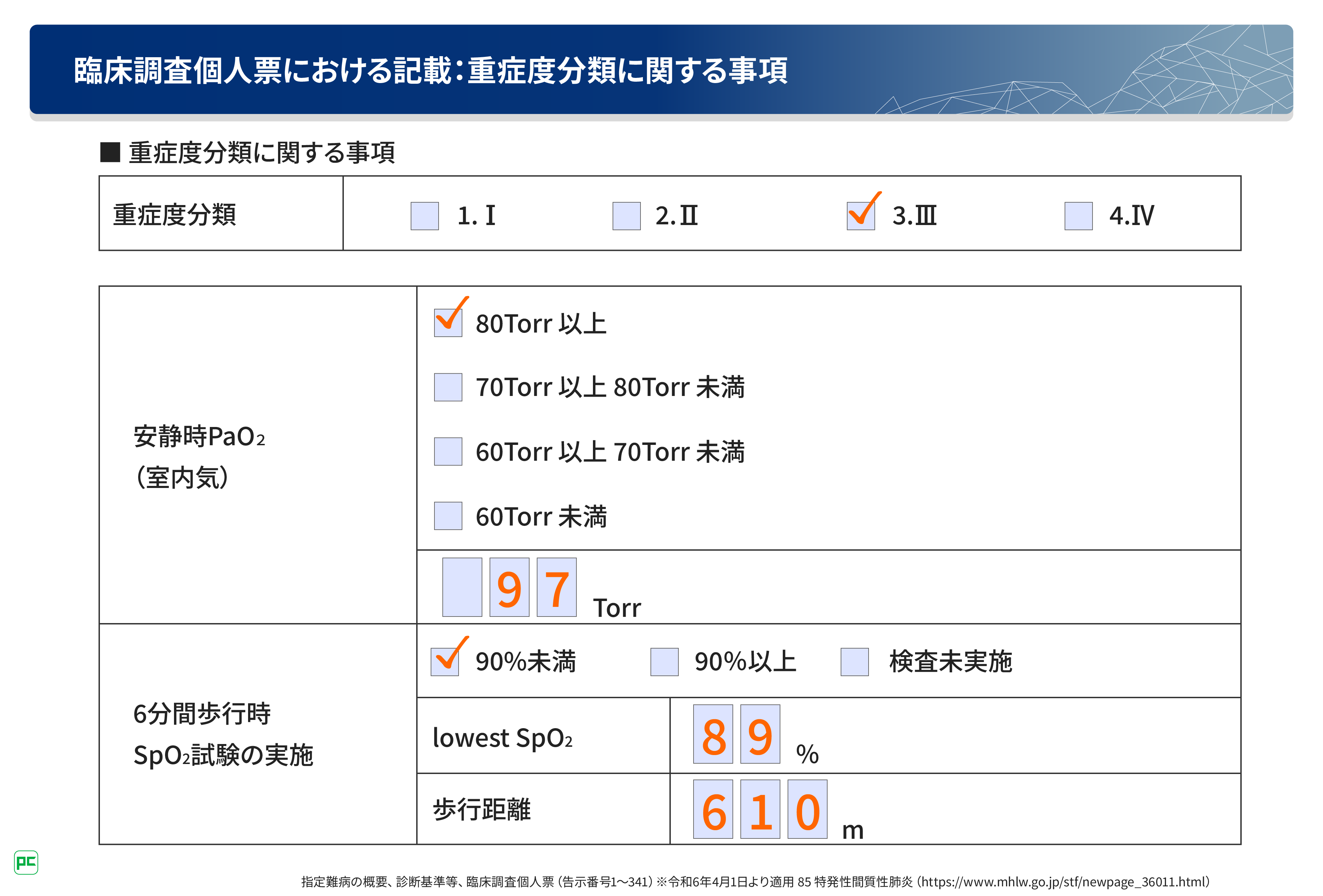 臨床調査個人票においては、重症度分類「Ⅲ」にチェックマークを入れ、安静時PaO2と6分間歩行時最低SpO2試験の実施についてそれぞれ記載します。なお、安静時PaO2が60Torr未満の場合は、6分間歩行テストの結果について記載する必要はありません(図17)。