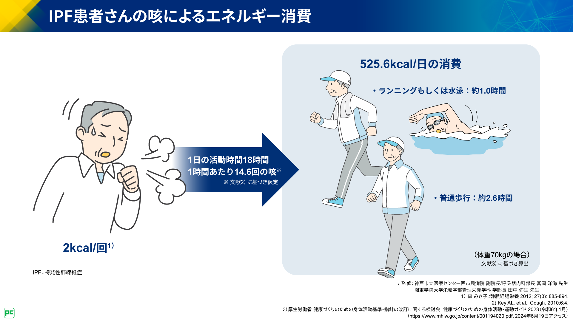 IPF患者さんでは咳と労作時呼吸困難が症状としてみられますが、このうち咳は1回あたり2kcalを消費するといわれています1)。IPF患者さんの1日の活動時間を18時間、1時間あたり14.6回咳をする※1と仮定した場合、咳による消費エネルギーは1日あたり525.6kcalとなります。525.6kcalというのは、体重70kgの方がランニングや水泳であれば約1.0時間、普通歩行であれば約2.6時間で消費するエネルギーとほぼ同じです(図1)※2。