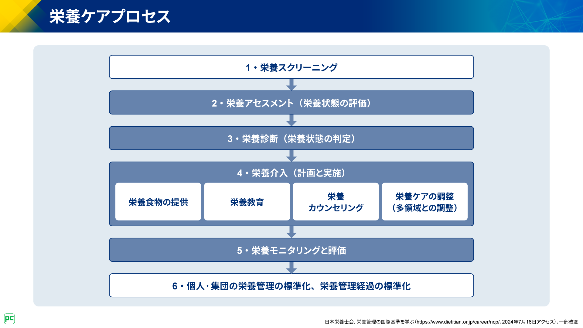 栄養ケアプロセスは、①栄養スクリーニング、②栄養アセスメント、③栄養診断、④栄養介入(計画と実施)、⑤栄養モニタリングと評価、⑥個人・集団の栄養管理の標準化、栄養管理経過の標準化の6つの手順で行われます(図8)6)。