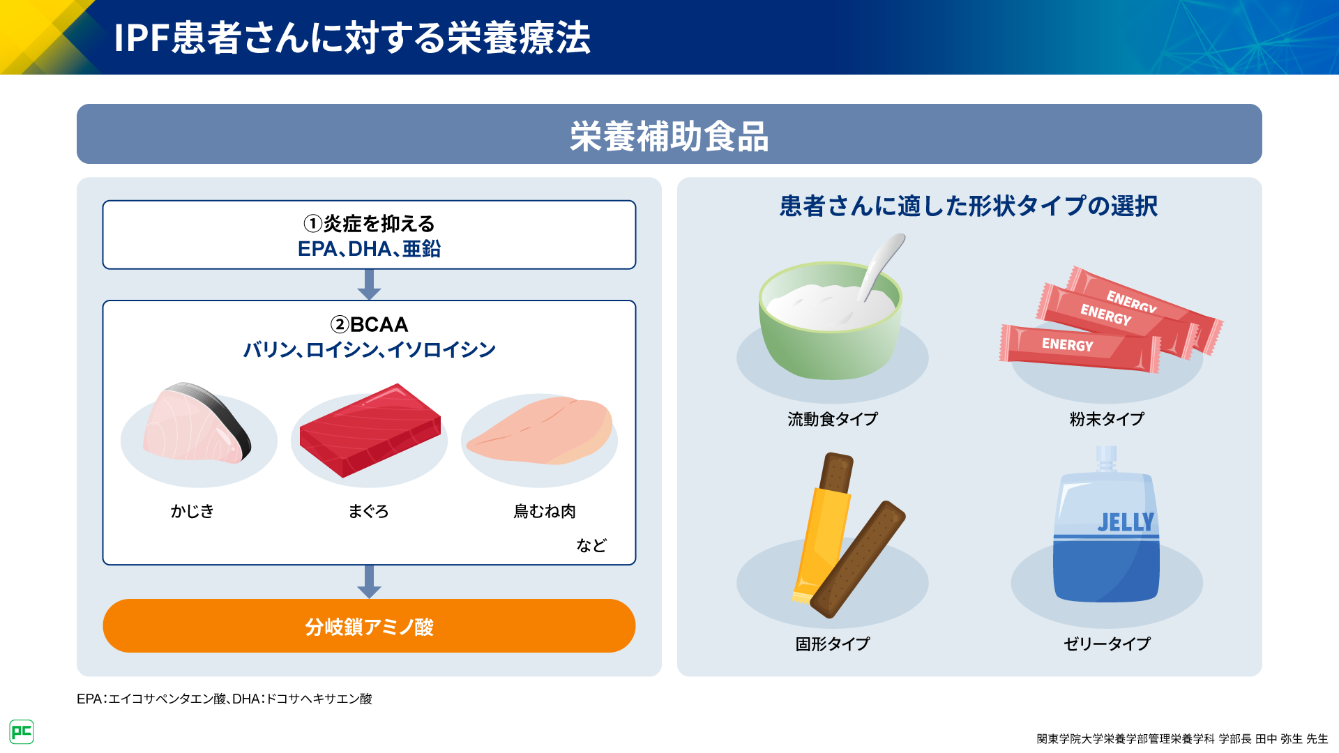 IPF患者さんに対する栄養療法を管理栄養士にご依頼いただくと、患者さんの状態に応じて具体的な食事方法やメニューをご提案することができます。IPF患者さんの栄養状態の悪化を防ぎ、抗線維化療法の継続や予後改善につなげていくためにも、管理栄養士による栄養療法を含めたIPF診療を進めていただけますと幸いです。